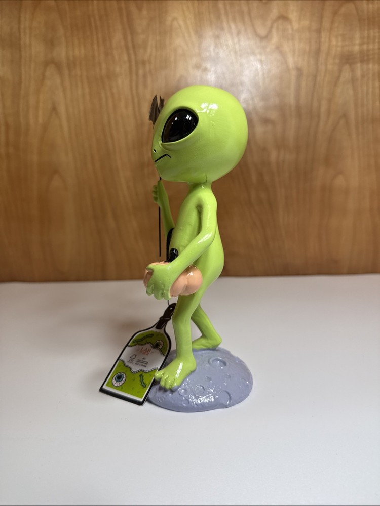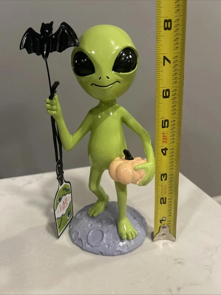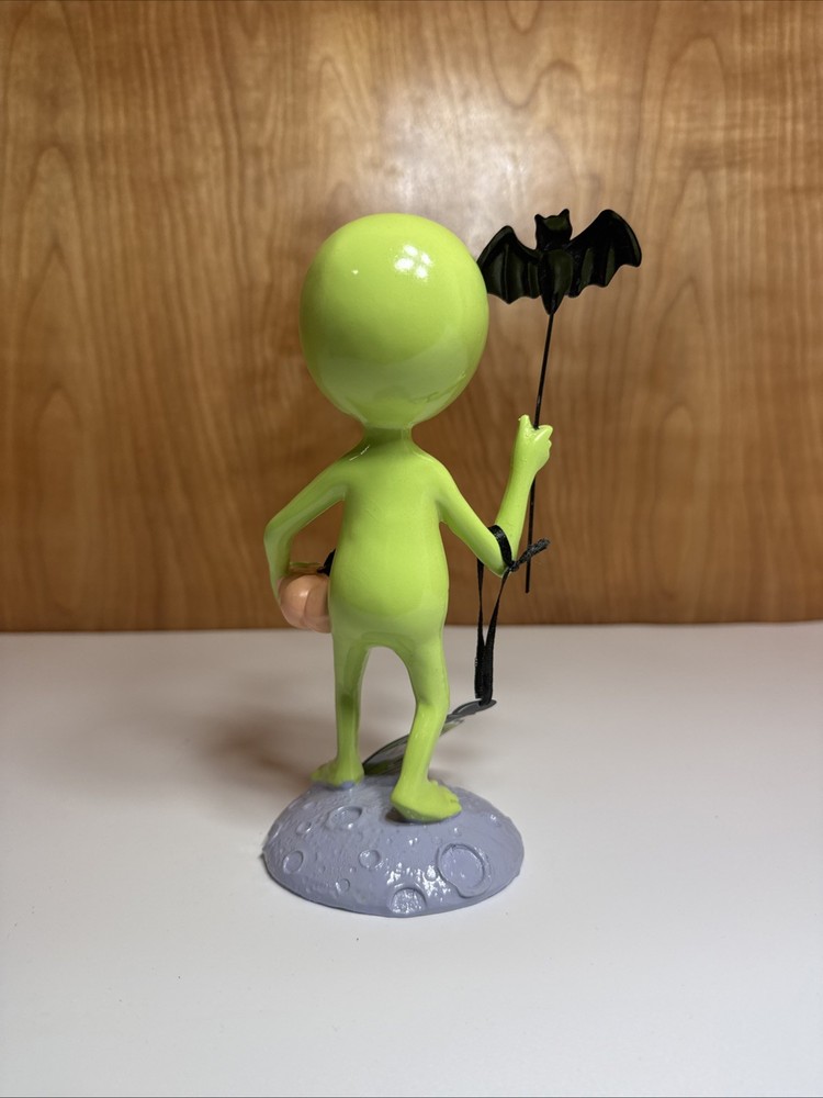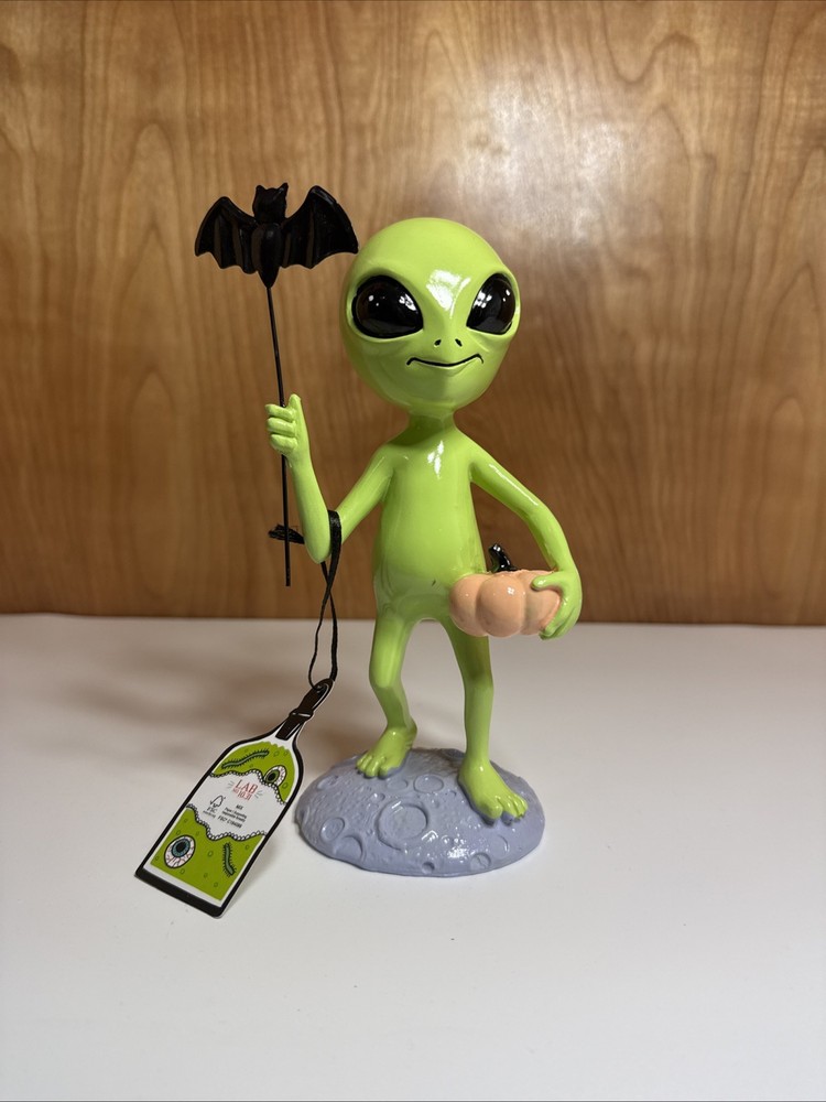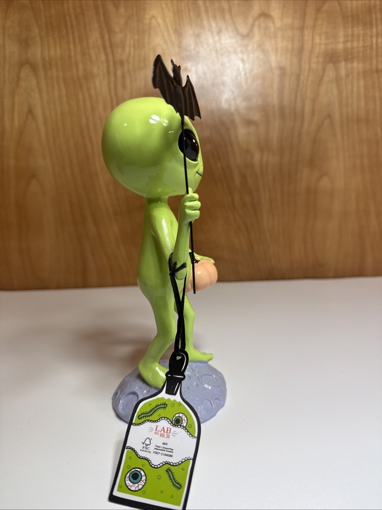 A fun and festive addition to your Halloween decor, this green alien figurine is ready for trick-or-treating! The alien is holding a pumpkin in one hand and a bat on a stick in the other. It stands on a moon-like base