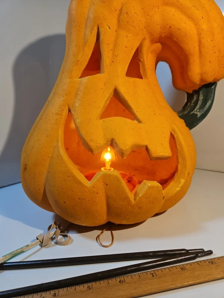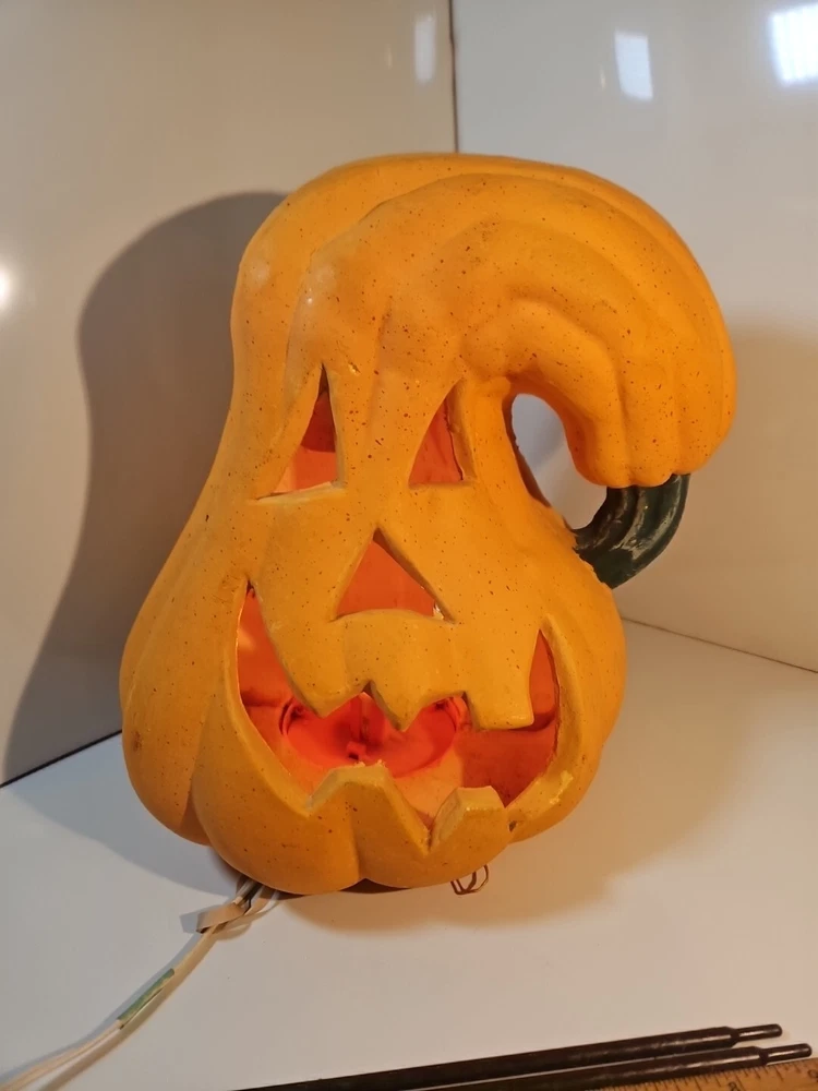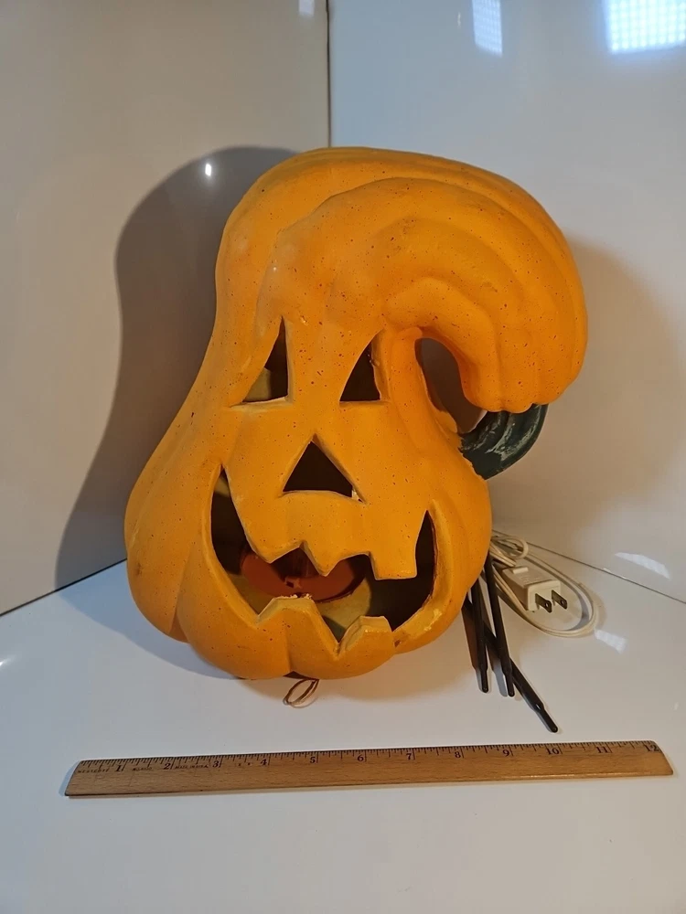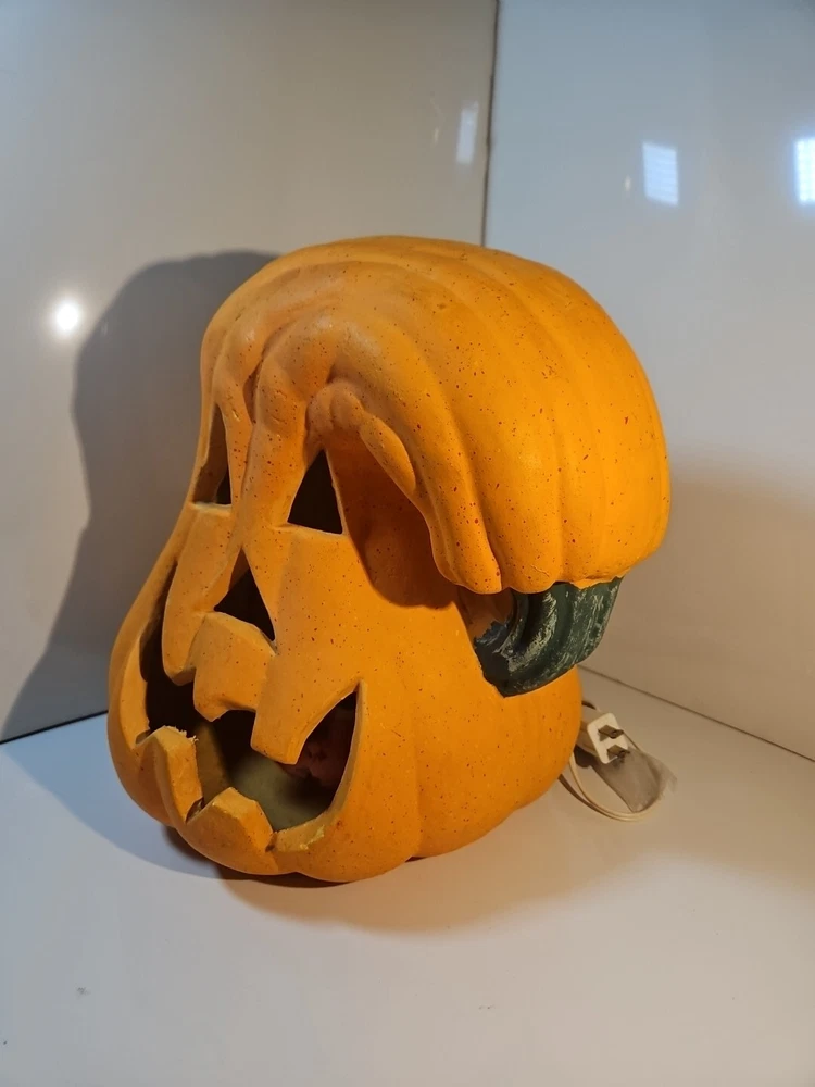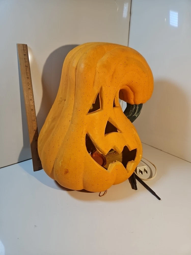 Halloween Pumpkin 11" Jack-O-Lantern Blow Mold Bent Stem w/Light GUC Product will be shipped timely and packaged with care. Offers are encouraged. Please feel free to reach out with questions. Please see pictures. Thank you. Good used condition. Light wear from age and use. Markings from age and use. See pictures See pictures. Markings from age and use. Sold as is seen. Functional as it should. Could use a deeper cleaning, original estate condition. Add a spooky touch to your Halloween decor with this 11-inch Jack-O-Lantern blow mold pumpkin. The pumpkin features a bent stem and a glow-in-the-dark effect that will create a creepy atmosphere in any setting. Perfect for indoor and outdoor use, this medium-sized lantern is made of durable plastic and is corded for power. The pumpkin decoration is designed with a pumpkin pattern and lantern subject, making it a great addition to your Halloween collection. This decorative outfit is perfect for Halloween occasions and will add a touch of excitement to your yard décor. Get your hands on this unique pumpkin Jack-O-Lantern and create a hauntingly beautiful display. Sku:industrialshelf1