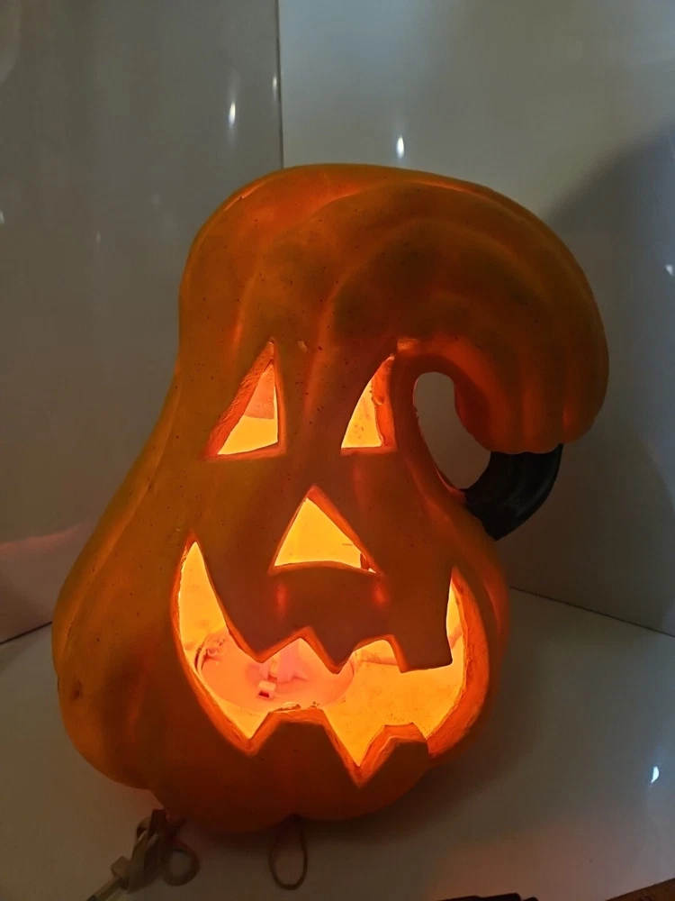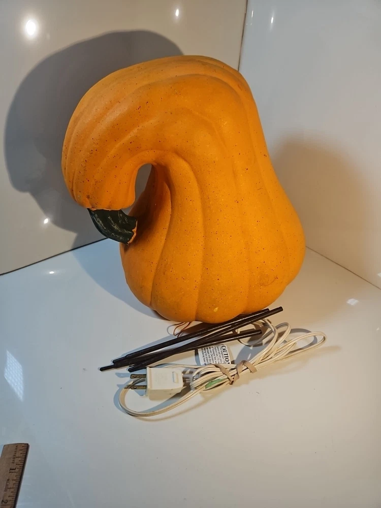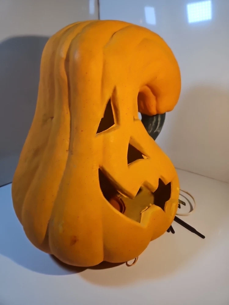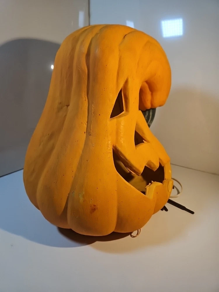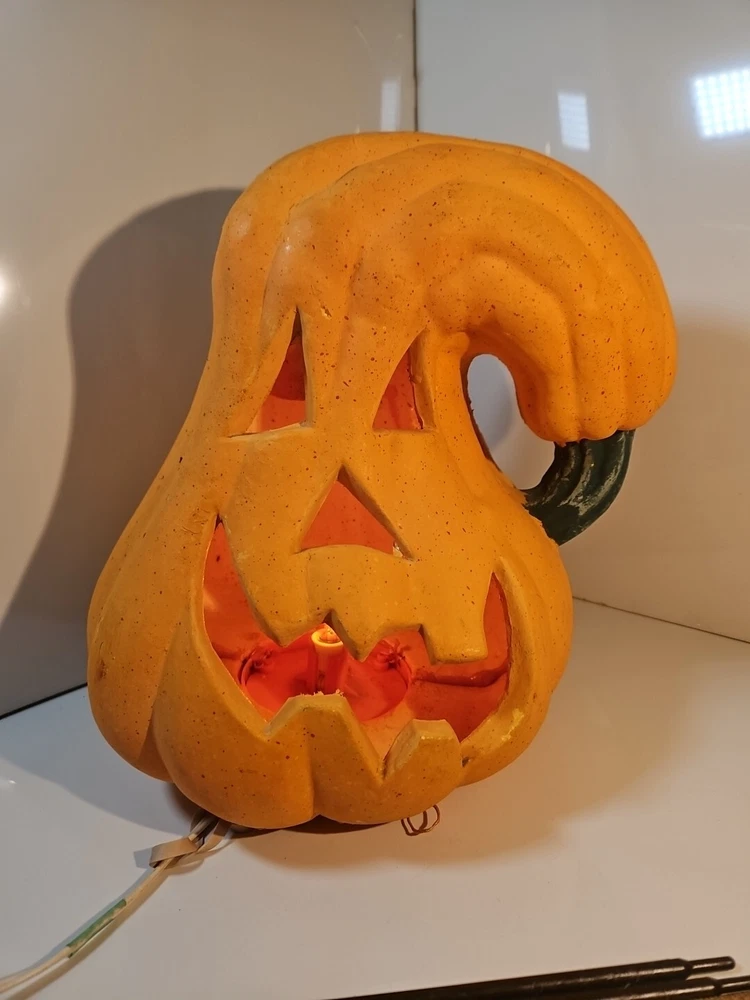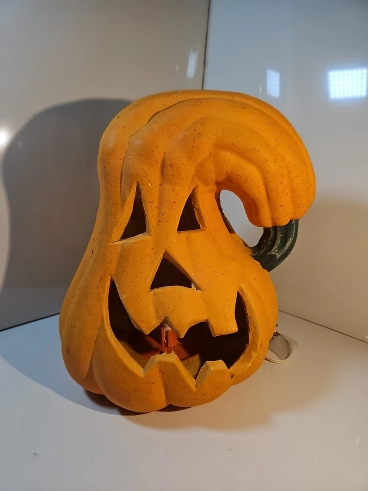 Halloween Pumpkin 11" Jack-O-Lantern Blow Mold Bent Stem w/Light GUC Product will be shipped timely and packaged with care. Offers are encouraged. Please feel free to reach out with questions. Please see pictures. Thank you. Good used condition. Light wear from age and use. Markings from age and use. See pictures See pictures. Markings from age and use. Sold as is seen. Functional as it should. Could use a deeper cleaning, original estate condition. Add a spooky touch to your Halloween decor with this 11-inch Jack-O-Lantern blow mold pumpkin. The pumpkin features a bent stem and a glow-in-the-dark effect that will create a creepy atmosphere in any setting. Perfect for indoor and outdoor use, this medium-sized lantern is made of durable plastic and is corded for power. The pumpkin decoration is designed with a pumpkin pattern and lantern subject, making it a great addition to your Halloween collection. This decorative outfit is perfect for Halloween occasions and will add a touch of excitement to your yard décor. Get your hands on this unique pumpkin Jack-O-Lantern and create a hauntingly beautiful display. Sku:industrialshelf1