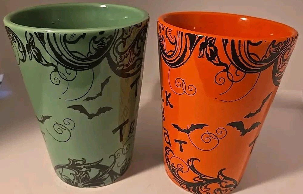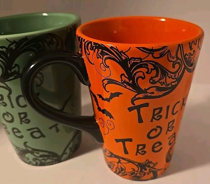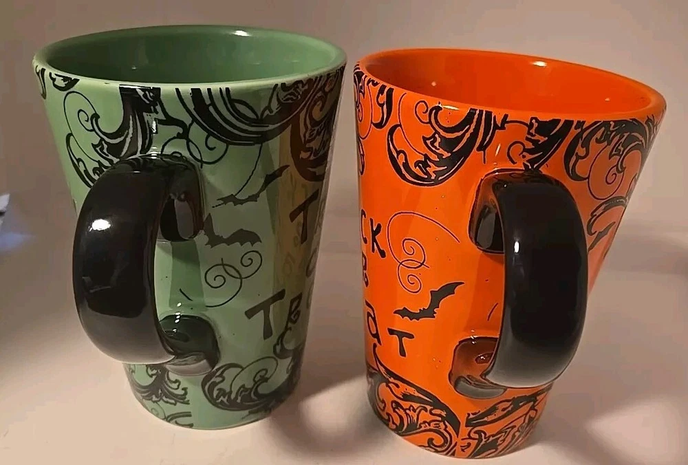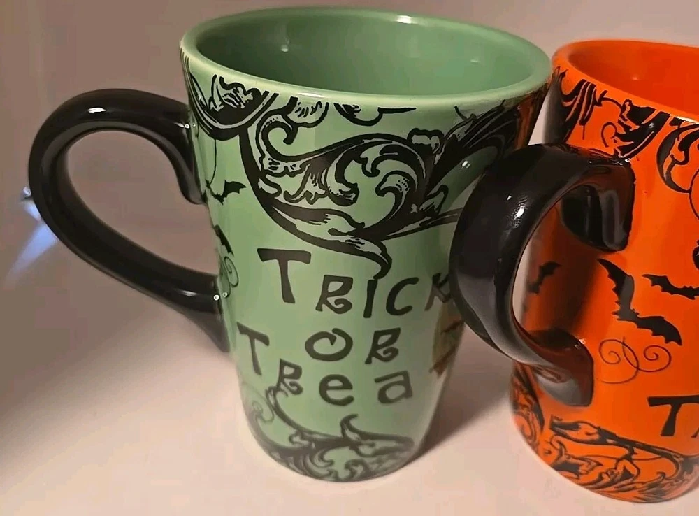 Get into the Halloween spirit with this festive set of two ceramic coffee mugs featuring a trick or treat pattern. The green and orange duo is perfect for Halloween enthusiasts and is sure to add some spooky fun to your coffee routine. With a capacity of 10 fl oz, these mugs are ideal for a generous cup of coffee or tea. The mugs are made by Hobby Lobby and are perfect for a service of two. Add some Halloween novelty to your mornings with these mugs that are sure to delight any guest.
