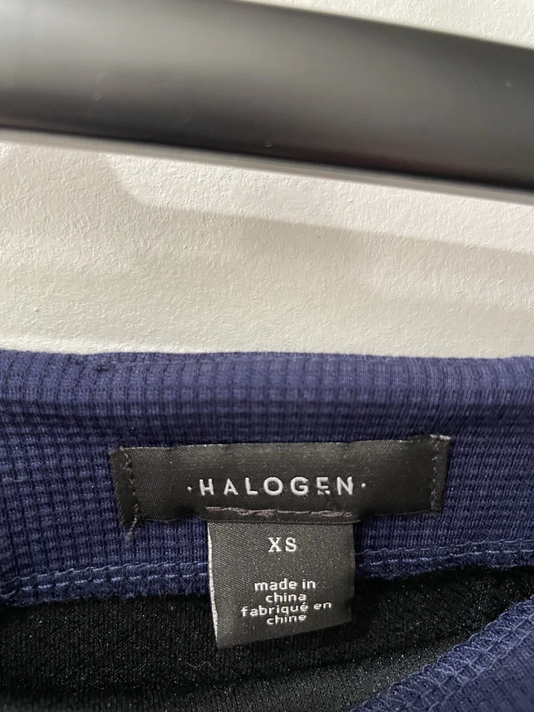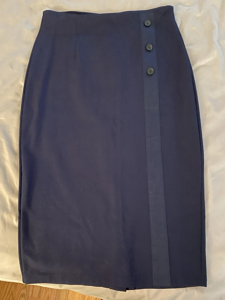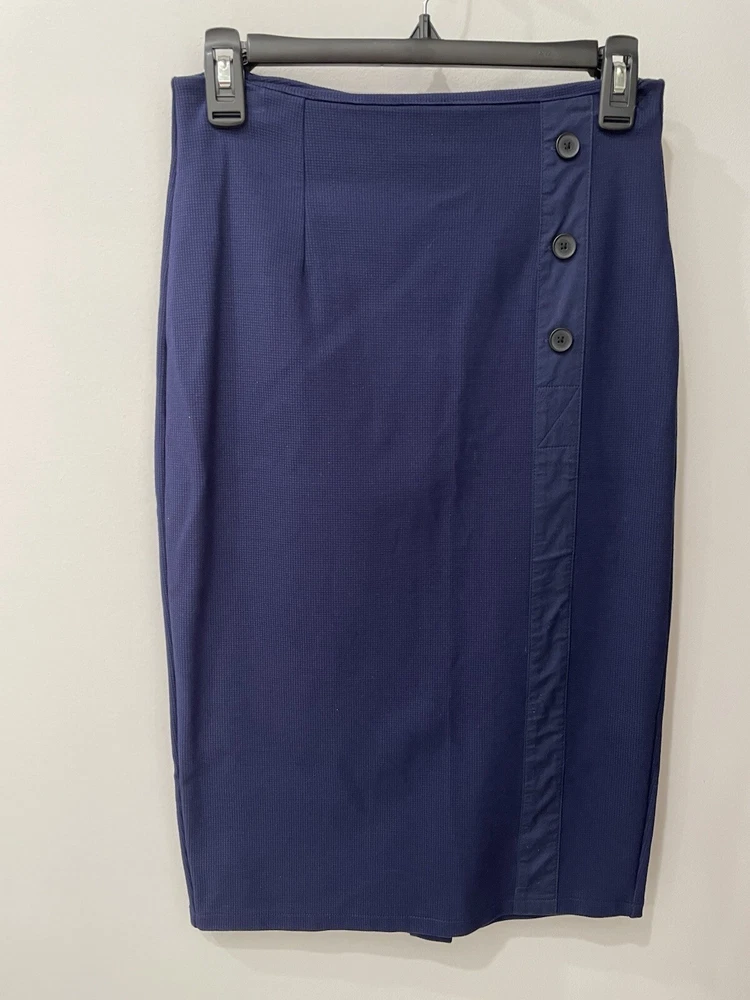 This Halogen skirt is a size XS in a solid blue color with a front side button design and back split. It is made of a Rayon Nylon Spandex fabric blend, tailored in a straight & pencil style. The skirt is below the knee in length and perfect for a fashionable and professional look.
