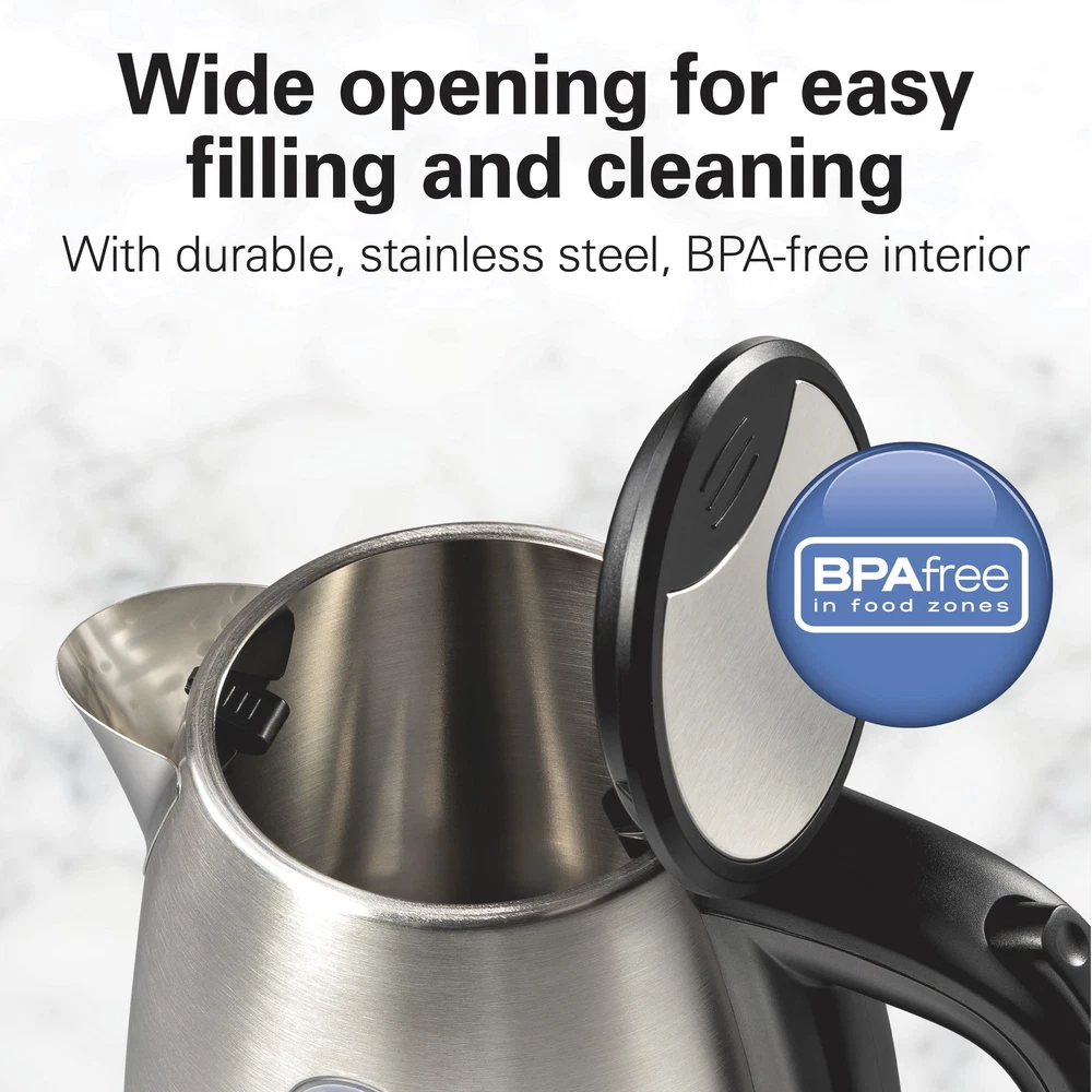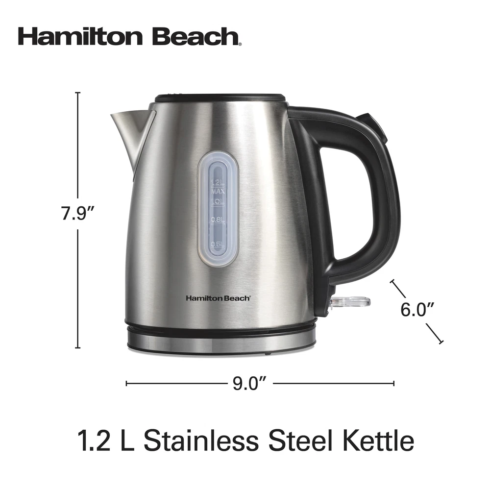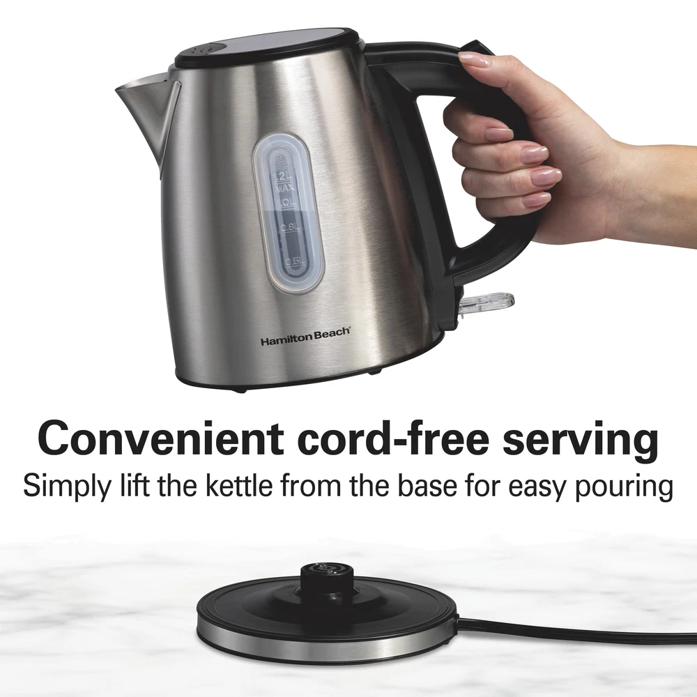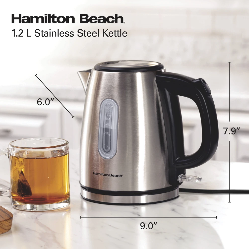 The Hamilton Beach® Stainless Steel Kettle makes it easy to prepare tea, instant coffee, hot cocoa, oatmeal, ramen and more. It has 1500 watts of power for ultra-fast heating, and you can heat 1.2 liters or 5 cups of water faster than a microwave and safer than a stovetop kettle. It's easy to use. Just fill the kettle with water, plug it in and press down the on/off switch near the base. Water heats up quickly and when it reaches a boil, the kettle and indicator light automatically turn off. You can effortlessly monitor the water level with the easy-view water window, and the stainless steel, BPA-free interior provides durability and peace of mind. For cord-free serving, the kettle lifts off the base to let you pour and serve at the table or anywhere you're prepping hot beverages or meals. For easy storage after use, wrap the cord under the base to keep the cord out of the way. Includes a removable mesh filter that helps prevent mineral scale from getting in your cup. ULTRA-FAST HEATING WITH 1500 WATTS: This electric kettle is faster than a microwave and safer than a stovetop kettle. Make a quick cup of tea or instant coffee anytime without the long wait — perfect for hectic mornings or anytime you need hot water fast. AUTO SHUTOFF WITH BOIL-DRY PROTECTION: The automatic shutoff function turns the stainless steel kettle off when water comes to a boil, and the boil-dry protection function keeps the kettle from scorching if the water level gets too low. EFFORTLESSLY MONITOR WATER LEVEL WITH EASY-VIEW WATER WINDOW: With the easy-view window, you'll always know how much water is in the tea kettle or how much water you're adding. The kettle's wide opening makes filling and cleaning easy. SPACE-SAVING COMPACT SIZE IS PERFECT FOR 5 SERVINGS: This compact kettle holds a total of 1.2 liters or 5 cups of water, so it's perfect for preparing up to 5 cups (8 oz. each) of your favorite hot beverages. WIDE OPENING FOR EASY CLEANING: This electric tea kettle's wide opening makes filling and cleaning easy. The stainless steel, BPA-free interior provides durability and peace of mind.