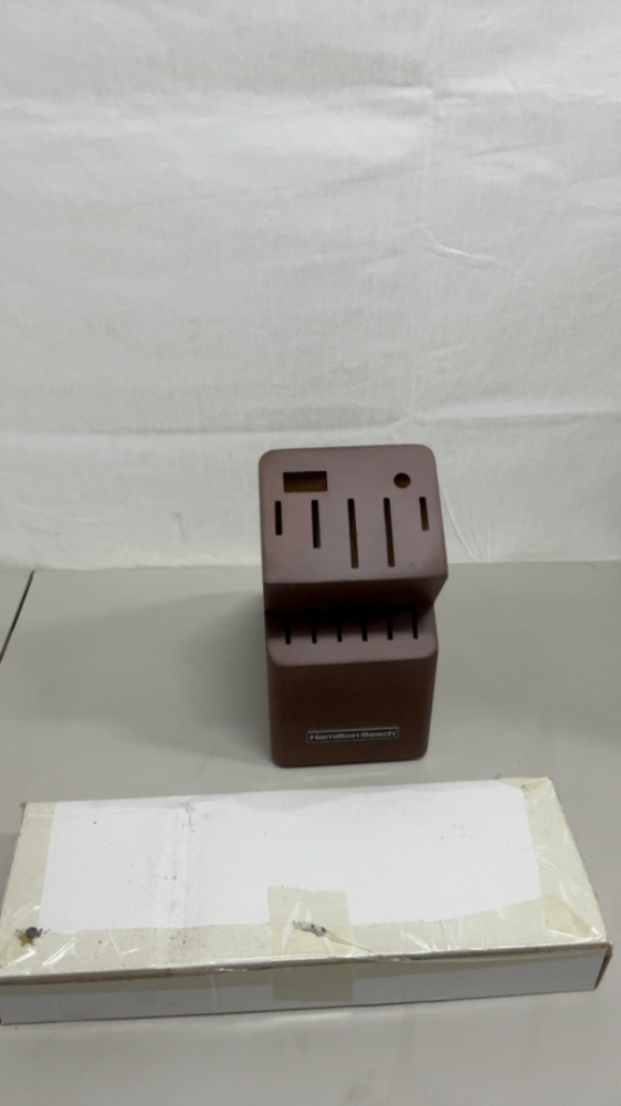 New. Retail box distressed. 14-Piece Hamilton Beach Knife Set includes 8" Chef’s Knife, 7" Santoku Knife, 8" Bread Knife, 5" Serrated Utility knife, (6) 4.5" Steak Knives, 3.5" Paring Knife, Sharpening Steel, Scissors, Hardwood Block. Free shipping applies within the United States only. However orders that are being shipped to Alaska, Puerto Rico, Guam, Virgin Islands, PO/FPO/APO boxes may require an additional fee. Please contact me for a shipping fee before purchasing.