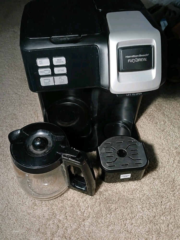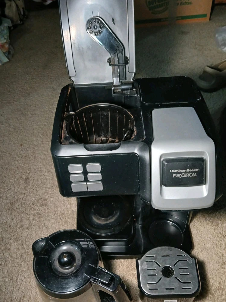 The Hamilton Beach 49976 FlexBrew Trio 2-Way Single Serve Coffee Maker is a versatile filter coffee machine that allows you to brew up to 12 cups of coffee. The coffee maker is in good condition and is ideal for a coffee lover.