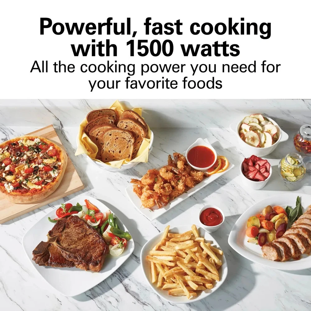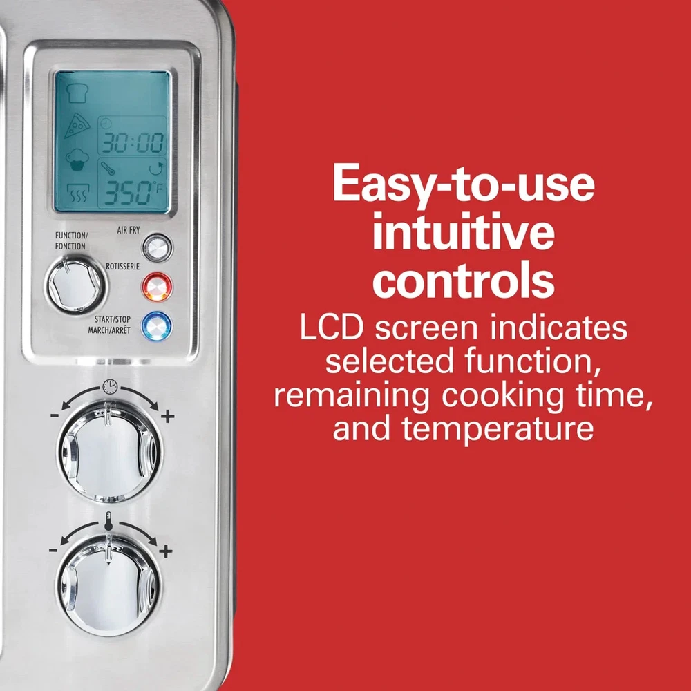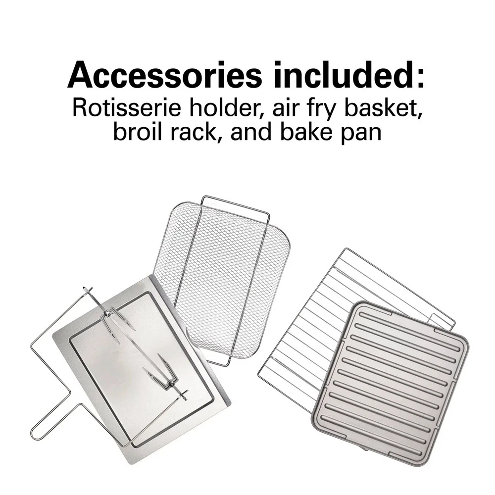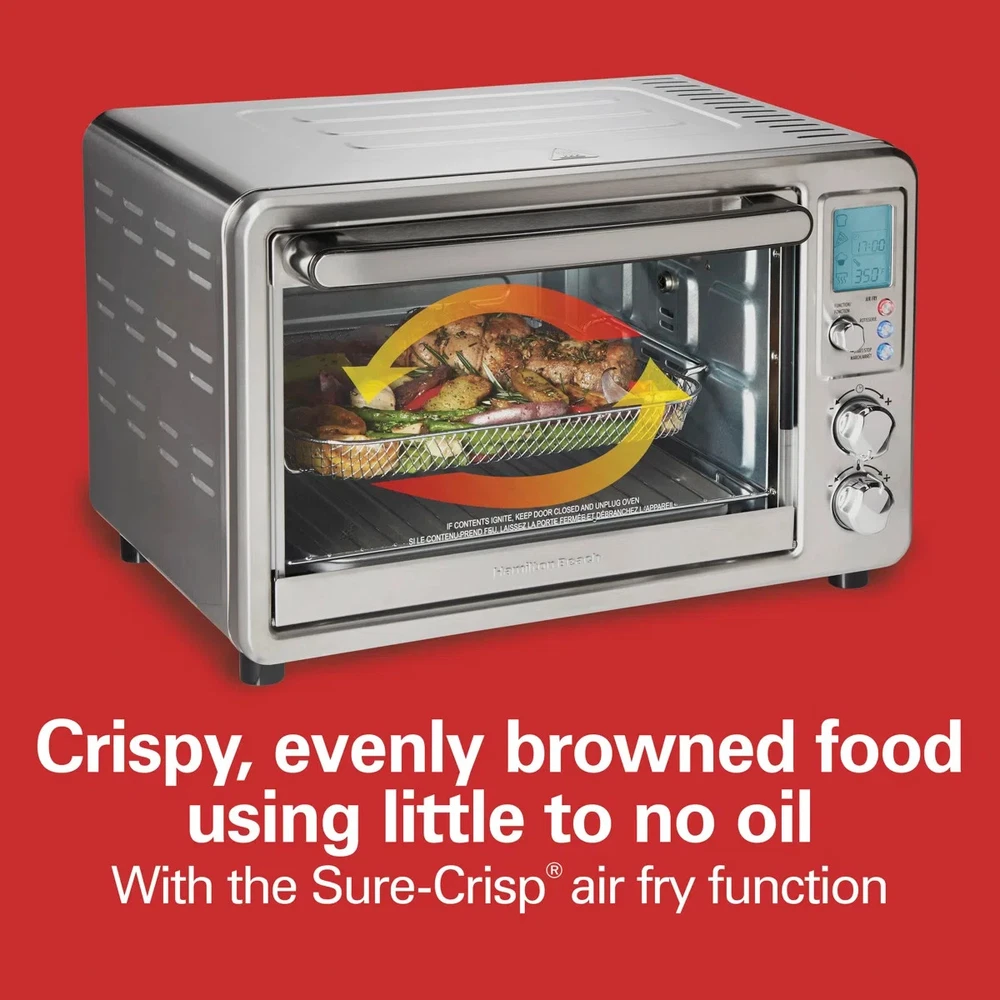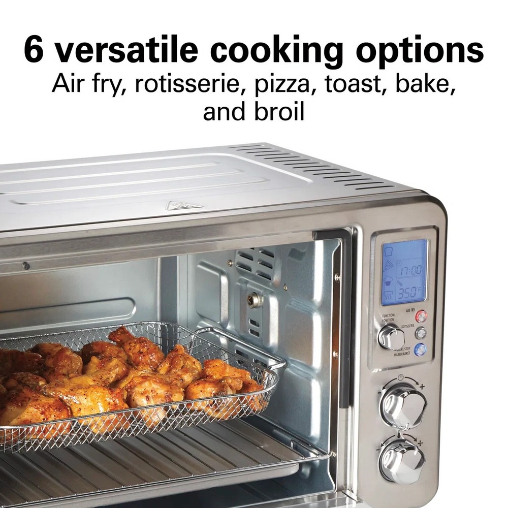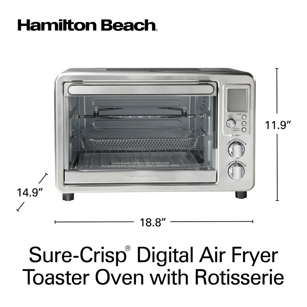 About This Product The Hamilton Beach sure-crisp digital air fryer toaster oven with rotisserie combines sure-crisp air frying functionality with the versatility of a rotisserie and classic toaster oven. You get the even crisping and browning of air frying right on your countertop, along with the ability to rotisserie, toast, bake, and broil. Using little to no oil, the sure-crisp function turns fresh or frozen french fries, chicken wings, steaks, fish, vegetables, and more into crispy deliciousness that you and your family will love. The Hamilton Beach sure-crisp digital air fryer toaster oven provides plenty of cooking space and lets you rotisserie a whole chicken, cook a 12" pizza, or toast 6 slices of bread. The intuitive controls include 6 settings to cover every cooking need and a digital LED panel to keep you informed about the preheating status, remaining cooking time, and current temperature. The oven features 3 rack positions for cooking flexibility and includes a mesh air-fry basket, rotisserie accessories, baking pan, broil rack, and slide-out crumb tray." Features The sure crisp air fry convection function circulates air around food as it cooks creating crispy and delicious fries chicken wings steaks fish vegetables and more. Go from air frying chicken on Friday to cooking a whole rotisserie chicken on Sunday. Additional settings for pizza, toast, bake, and broil add versatility and have a beep at the end of the cycle. This toaster oven with an air fryer has plenty of room for everything from a whole rotisserie chicken, 12" pizza, 6 slices of toast, or a 9" x 12" baking pan. Three rack positions provide flexibility to fit a variety of food. The air fryer oven comes with all the accessories you need to air fry, bake, broil, and toast, plus a slide-out crumb tray. LCD screen indicates your selected function, the remaining cooking time, and the temperature. Includes adjustable temperature dial and cooking timer with auto shutoff and stay-on setting. Product Dimensions Other Dimensions Overall 14,013'' H X 20.63'' W X 17.25'' D Overall Product Weight 17 lb. Details Product Type Toaster Oven Material Stainless Steel Color / Finish Silver Timer Yes Plug-In Yes Wattage 1,500 Watt Imported Yes Product Care Hand wash only Warranty Commercial Warranty No