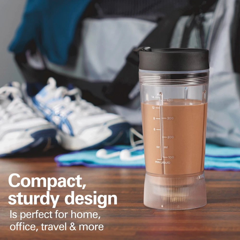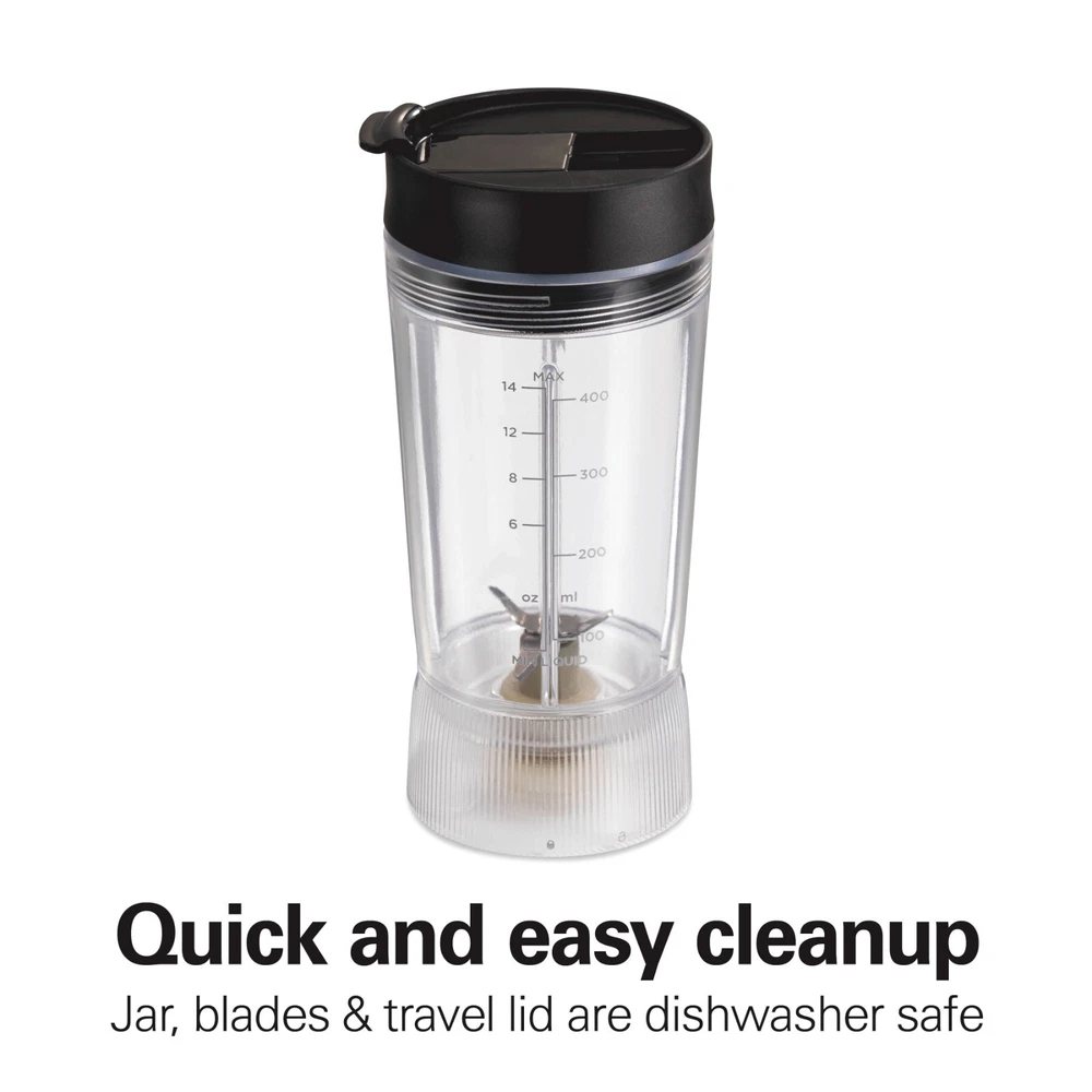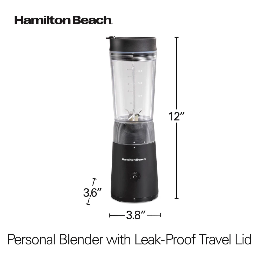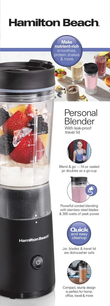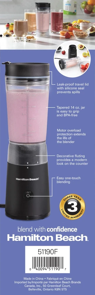 Product details Enjoy nutrient-rich smoothies, protein shakes and more on-the-go with the Hamilton Beach Personal Blender with Leak-Proof Travel Lid. It's fast and easy to use. Pour liquid ingredients into the jar first, add solid ingredients such as ice and fruit, attach the lid to the jar, and press the pulse button to blend. Thanks to the durable stainless steel blades and 300 watt peak-power motor, drinks are blended quickly and smoothly. Because the leak-proof travel lid has a silicone seal to prevent messy spills, this portable personal blender is perfect taking nutritious drinks in your car, to the gym or on a walk. After you blend, the jar, blades and lid are dishwasher safe for easy cleanup. BPA-free in food zones and backed with a 3 year limited warranty by Hamilton Beach. Condition: New MAKE NUTRIENT-RICH SMOOTHIES, PROTEIN SHAKES AND MORE : With the push of a button, the stainless steel blades of this compact blender easily cut through ingredients to deliver smooth results for smoothies, protein shakes, milkshakes, icy drinks and more. BLEND AND GO WITH 14 OZ. SEALED JAR : The leak-proof travel lid has a silicone seal to prevent spills and a cap that opens for sipping on-the go. The tapered jar is easy to grip, and the base's decorative fluting provides a modern look on the counter. POWERFUL BLENDING PERFORMANCE : With durable stainless steel blades and 300 watts of peak blending power, this corded blender easily powers through every blending task, from drinks and baby food to homemade salad dressing, pizza sauce and marinade. QUICK AND EASY CLEANUP : This smoothie blender comes with a jar, blades and travel lid that are dishwasher safe for easy cleanup. COMPACT, STURDY DESIGN : The compact size of this blender makes it perfect for home, office, travel and more. The sturdy base resists tipping, and the blender tucks away on a kitchen shelf or in a cabinet for easy storage. Condition: New Brand Hamilton Beach Blender Type Personal Blenders Base Color Black Blade Material Stainless Steel Number of Speeds 1 Watts 300 W Cord Length 30 in Accessories Included Leak-Proof Travel Lid Assembled Product Weight 2.05 lb Manufacturer Hamilton Beach Brands Inc. Manufacturer Part Number 51190F Assembled Product Dimensions (L x W x H) 3.94 x 4.13 x 12.20 Inches