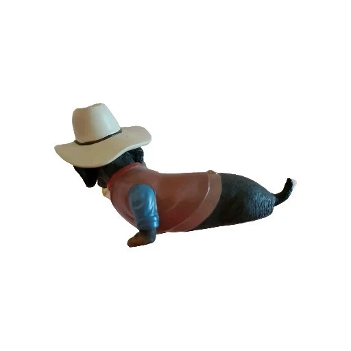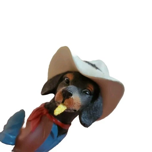 This is an adorable dachshund dog wearing his cowboy outfit and with a sprig of grass in his mouth. Make of quality resin. Measures approximately 6.5 inches long by 4 inches tall. No physical defects.