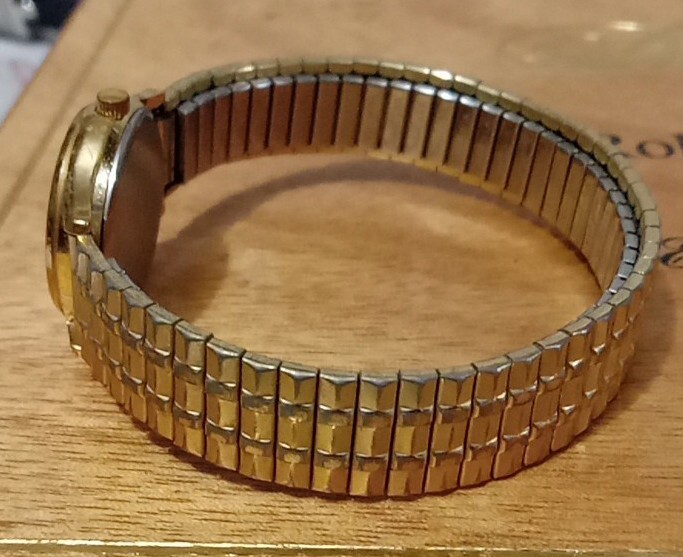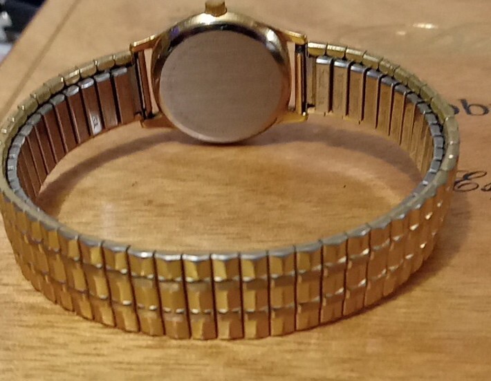 Women's SWISS Watch HAMILTON 9818. Logo on the dial. The watch has a white face with gold hands and number markers. Has a gold tone stainless steel stretch band. Swiss movement, water resistant, and needs new battery. The watch is in good condition no visible scratches on dial