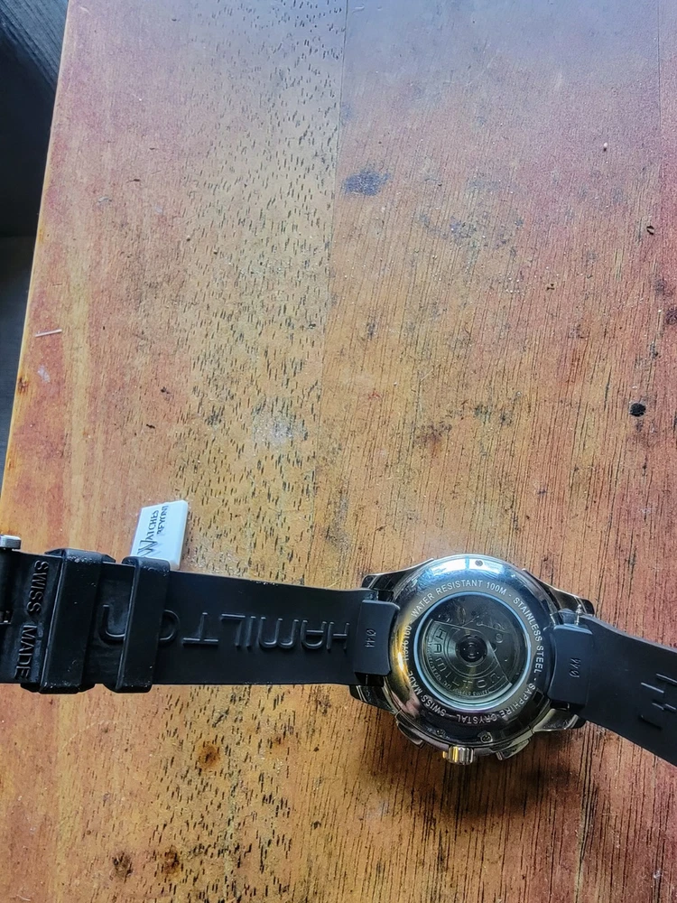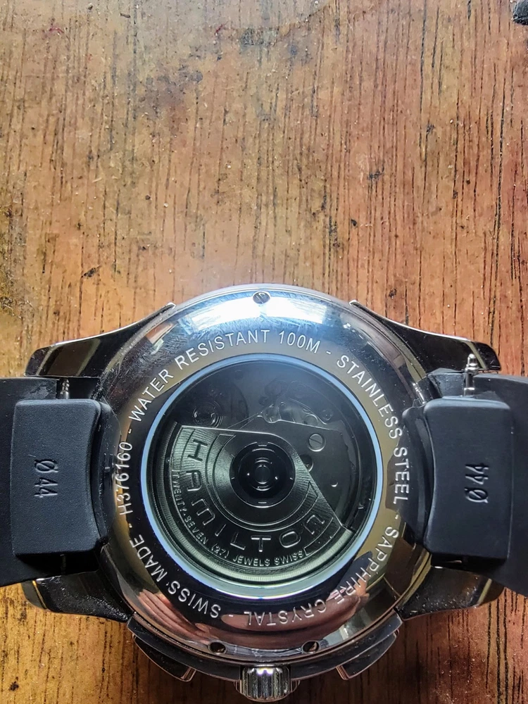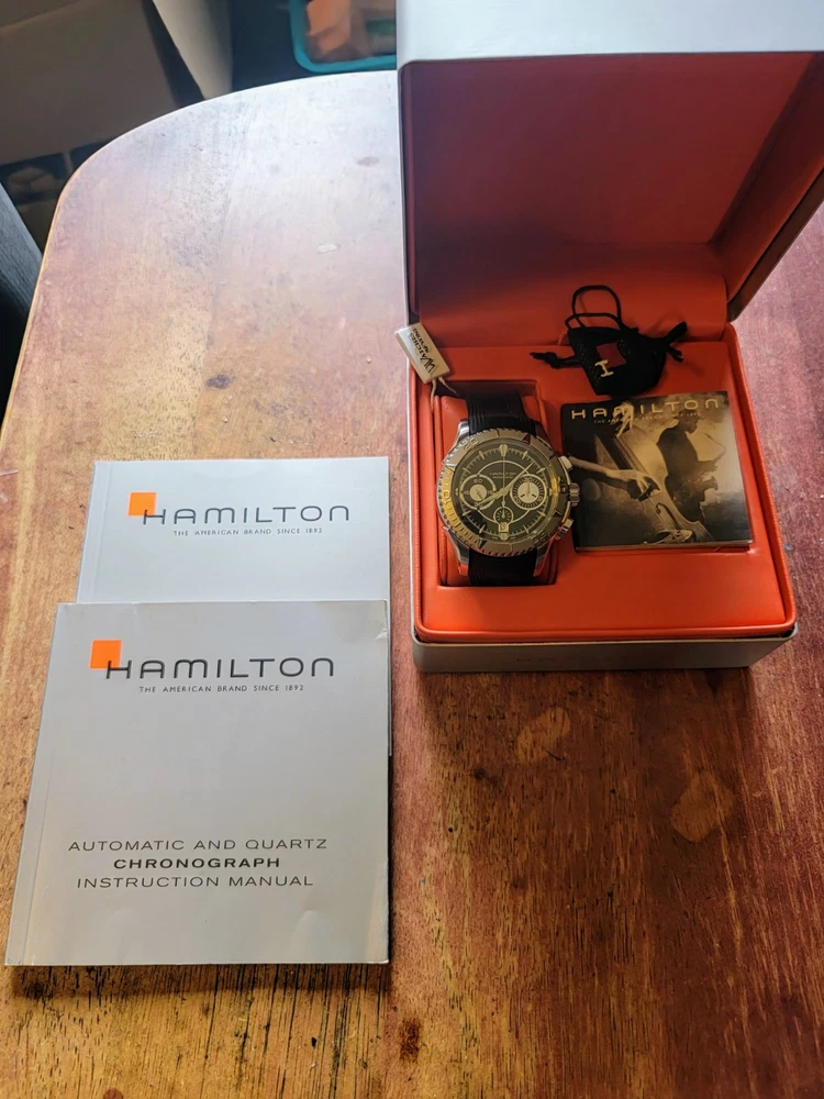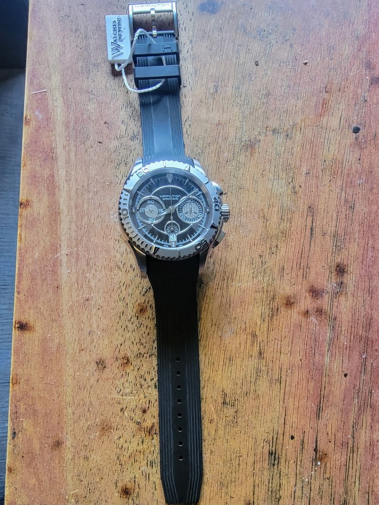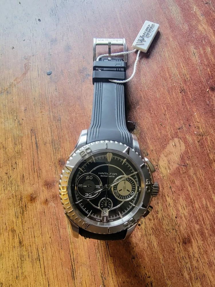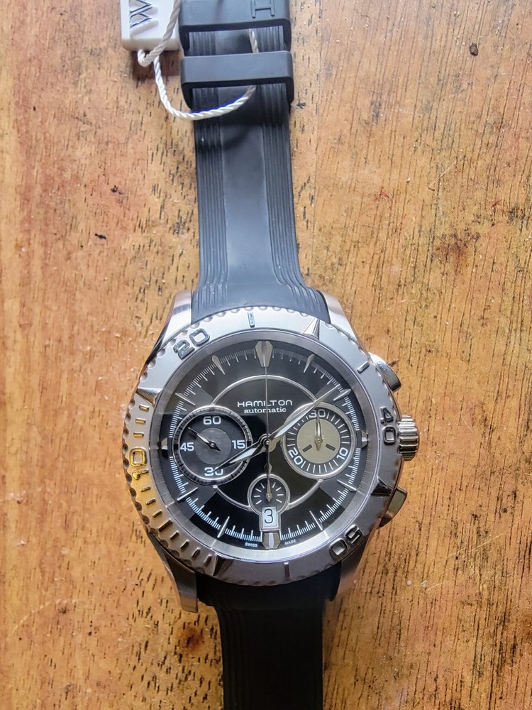 The Hamilton Jazzmaster Seaview Chronograph Automatic 44mm is a luxurious men's wristwatch crafted in Switzerland. The watch features a sleek black dial with silver accents, housed in a 44mm stainless steel case with an exhibition caseback. It boasts a unidirectional rotating bezel, 27 jewel valjoux 7753 movement, and a rubber two-piece strap with a buckle closure. Case is both brushed and polished. This sporty yet elegant timepiece includes a chronograph function and offers water resistance up to 100 meters. The watch comes with its original box and packaging, along with a manual/booklet, making it a desirable choice for watch enthusiasts seeking a high-quality and stylish accessory. Watch was purchased last year and barely worn. 1 or 2 times. Selling a few out of my collection to down size. Feel free to send me a message if you have any questions. Thank you.