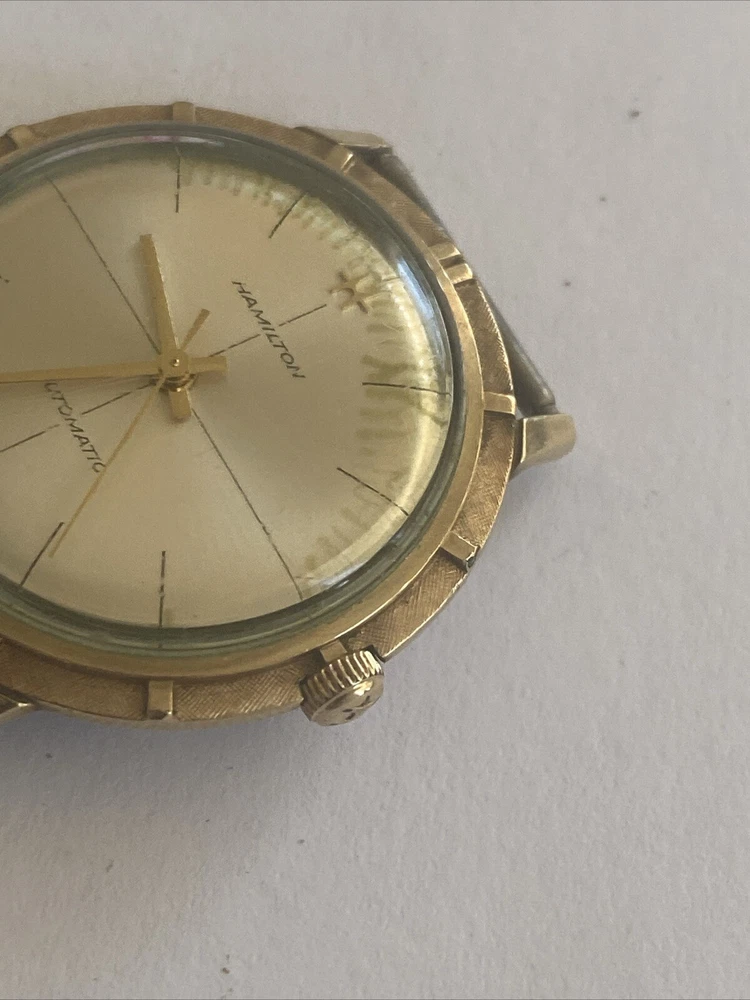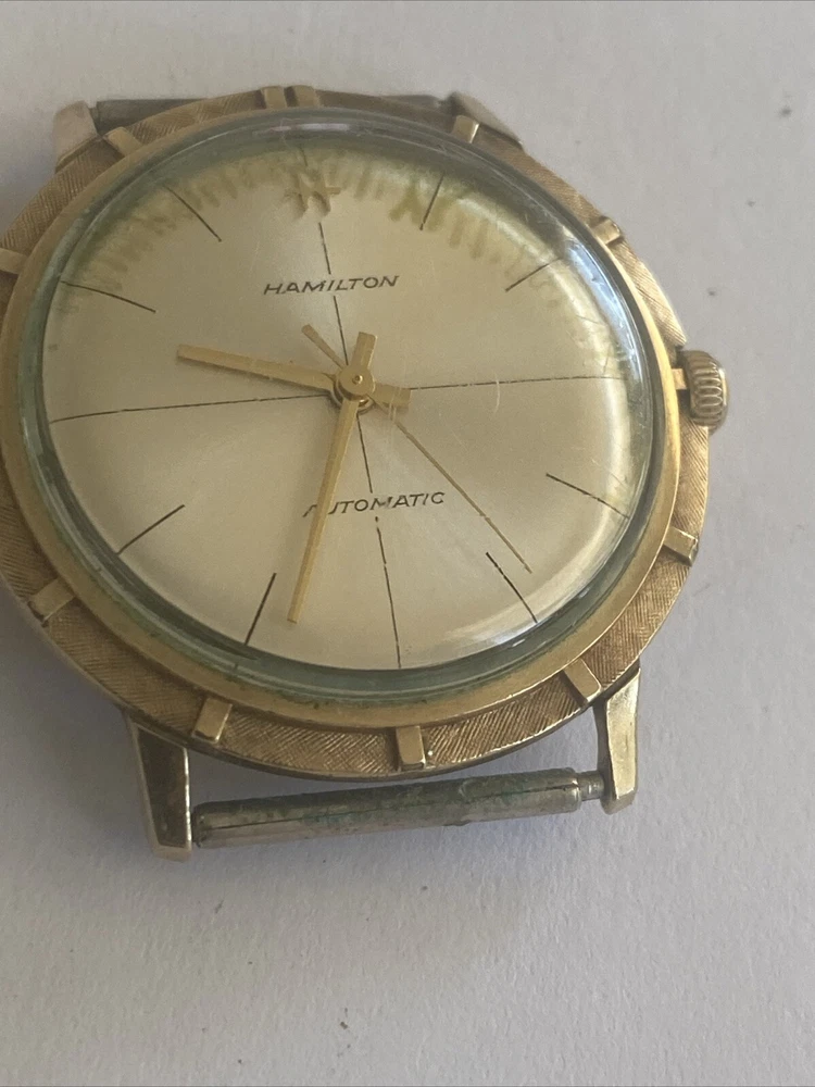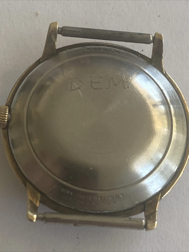 Crafted for the discerning gentleman, this Hamilton men's wristwatch presents a seamless blend of classic sophistication and modern functionality. The 10k RGP case ensures durability and a timeless aesthetic, encasing the precision mechanism that Hamilton is renowned for. With its elegant design, this timepiece complements both casual and formal attire, making it a versatile addition to any wardrobe. The watch stands as a testament to Hamilton's commitment to quality and style, ideal for the modern man who appreciates the finer things in life. Sold as is. Engraved It ticks!