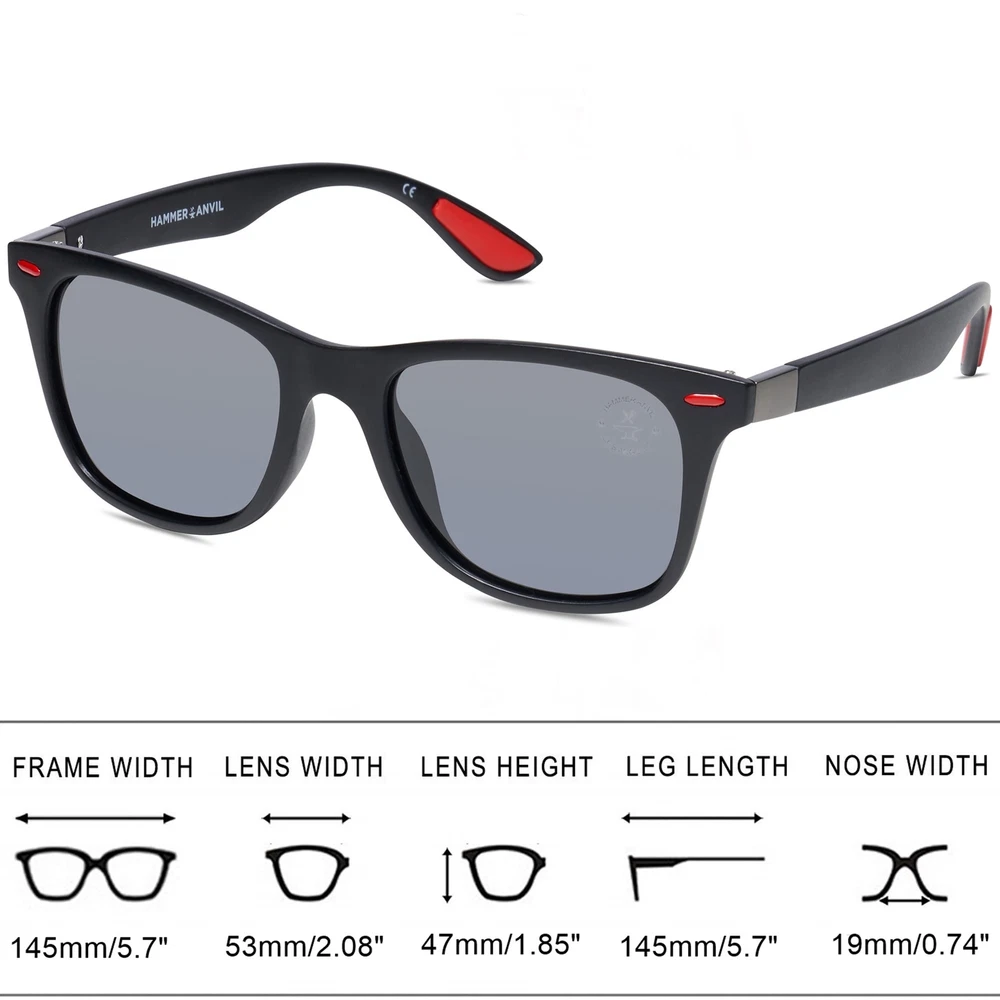 FAST & FREE SHIPPING 30 Day Returns Best Deals Guaranteed Hammer Anvil Mens Retro Polarized Sunglasses Classic Vintage Driving Glasses Polarized Sunglasses By Hammer Anvil Product Features : TRP90 & Metal STYLISH FRAMES - The Hammer Anvil Retro sunglasses are the ultimate modern classic. The versatile and stylish frames look great on many face shapes and elevate any outfit, making them a timeless accessory. POLARIZED LENSES - Features 100% UV 400nm protection to shield your eyes from harmful UVA, UVB and UVC rays. These sunglasses have polarized lenses that provide superior protection, comfort, and clarity of vision than traditional non-polarized lenses. Polarized lenses offer high sun glare protection by filtering bright light reflected on surfaces like water, snow, and sand to reduce eye strain and fatigue. LIGHTWEIGHT MATERIALS - Choose from multiple frame colors that are built with durable yet lightweight TRP 90 plastic with a matte finish and red accents the frame rims and red rubber accents on the temple tips to prevent slipping. Metal hinges and ergonomically designed frames comfortably accommodate your face and stay securely in place on your nose and around your ears. Signature Hammer Anvil logo is elegantly engraved in the top corner of the left lens. ACCESSORIES - Includes 1 pair of sunglasses that arrives beautifully packaged in a black Hammer Anvil gift box. MEASUREMENTS - Frame width: 145 mm (5.7 inches) | Lens width: 53 mm (2.08 inches) | Lens height: 47 mm (1.85 inches) | Leg length: 145 mm (5.7 inches) | Nose bridge width: 19 mm (0.74 inches) MSRP $49.50 Now Offering FREE SHIPPING and 30 Day RETURNS on all our Items. Thanks for Shopping with Artofdeals.