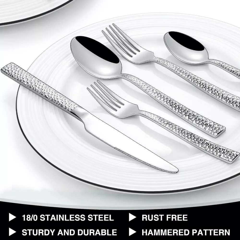 Item model number xike-1004CA Is Stain Resistant Yes Style Square Hammered Special Feature Rust Resistant Material Stainless Steel Is Dishwasher Safe Yes Item Weight 4.86 pounds Recommended Uses For Product Home, Party, Wedding, Camping, Travel Number of Pieces 40 Finish Type Polished Package Dimensions 9.57 x 5.83 x 2.24 inches Product Care Instructions Dishwasher Safe Included Components 8 Dinner Forks, 8 Salad Forks, 8 Dinner Spoons, 8 Dessert Spoons, 8 Dinner Knives