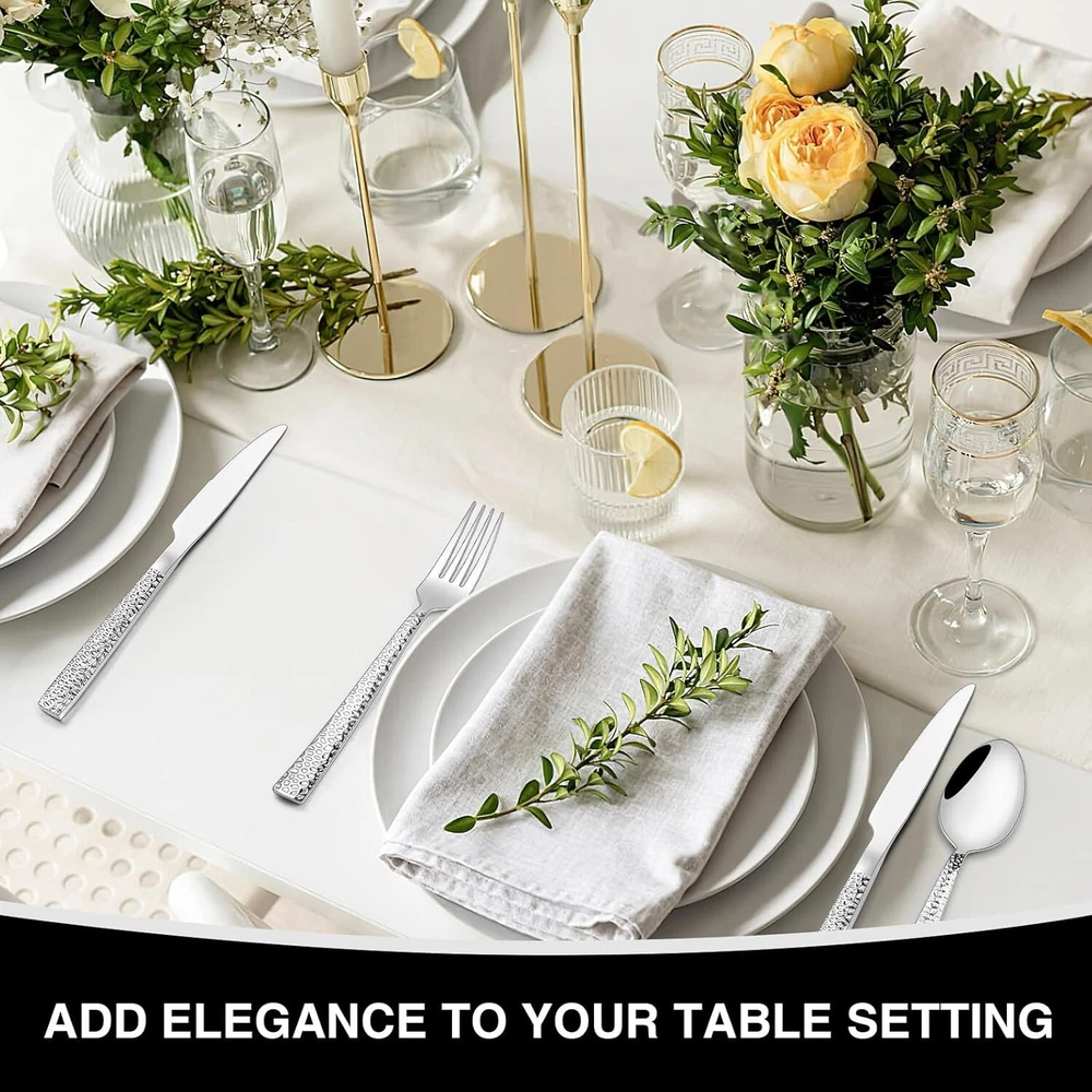 Hammered Silverware Set, 40-Piece Stainless Steel Square Flatware Set for 8, Food-Grade Tableware Cutlery Set, Utensil Sets for Home Restaurant, Mirror Finish, Dishwasher Safe Number of Pieces 40 Material Stainless Steel Color Mirror Finish Product Care Instructions Dishwasher Safe Recommended Uses For Product Indoor Special Feature Rust Resistant Finish Type Polished Included Components 8 Dinner Forks, 8 Salad Forks, 8 Dinner Spoons, 8 Dessert Spoons, 8 Dinner Knives Style Square Hammered About this item PREMIUM 40-PIECE SILVERWARE SET FOR 8: This flatware set contains 8 dinner forks, 8 salad forks, 8 dinner spoons, 8 dessert spoons, 8 dinner knives. It’s the ideal set for home daily use, and also for restaurants, pubs, cafes, and hotels. This cutlery set also help your dinner full of design while having a party. USE AND MAINTENANCE: Recommend hand wash first, storage them after drying. Wire brush, hard sponge, cleaning cloth or any other hard material are not recommend , it will damage the silver. PROPER WEIGHT AND COMFORTABLE HANDLE: The curvature of our utensil handles is designed according to the posture of the hand, and the appropriate weight and perfect balance are added to ensure maximum comfort during use that avoids you feel tired. Moreover, the smooth edges ensure safety and no scratches. ASHIONABLE APPEARANCE - Elegant style with hammered design on the front side of each square handles, Making every meal like a high-end banquet and bring a pleasant dining atmosphere, Matching different tablecloths, The design of the handle can highlight more styles HIGH-QUALITY STAINLESS STEEL: Made of premium food-grade stainless steel, providing the longest term value and the best properties, it offers nice resistance to rust and corrosion to get the most sturdy and healthy experience while using, never bend in daily use.