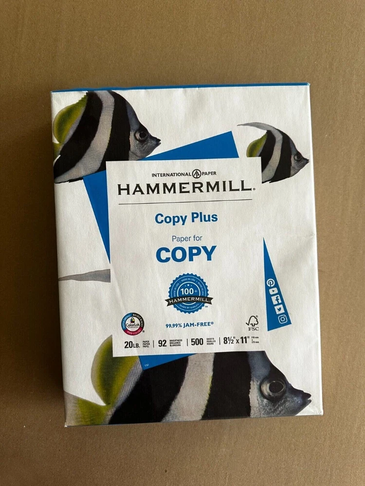 Authentic & New & Sealed Or Your Money Back Everything is new , Sealed Box! You will receive an unopened box! All of our items are new stock. It is 2024 version. We always guarantee our quality of product or your money back! Hammermill Copy Plus Paper, Letter (8.5" x 11"), 500 sheet 20LB, Case Of 10 Ream Case Of 10 Ream = 5000 sheets Made In The USA FREE SHIPPING Description Copy Plus printer paper is an economical paper designed for everyday use at offices large and small. Offering dependable performance on all office machines, you'll want to have plenty of this dependable paper on hand for everyday, general office use. It works well in high-speed copiers, dry toner plain-paper copiers and fax machines. ColorLok® for bolder blacks, brighter colors and faster drying. Backed by the 99.99% Jam-Free® Guarantee. Acid-free material prevents yellowing over time to ensure a long-lasting appearance. You'll want to have plenty of this economical yet dependable paper on hand for everyday, general office use. Works well in high-speed copiers, dry-toner plain-paper copiers and fax machines. Perfect for everyday black and white printing, internal documents and backup hard copies. 99.99% JAM-FREE® guarantee. With ColorLok® technology, blacks are up to 60% bolder, colors up to 30% more vivid and ink dries up to 3x faster. Acid-free for archival quality. Contributes toward satisfying credit MR1 under LEED. Specification Manufacturer ESS Brands Model # ESS-HAM105031 Shipping Weight 5.11 pounds MPN 10503-1 UPC 010199005038 GTIN 00010199005038 FREE SHIPPING We will ship the package within 72 hours (except on Sundays and holidays) after the payment cleared. Items will be shipped by USPS First Class Mail or Priority mail. It takes about 2-5 days to deliver. Shipping time varies greatly depending on the Postal Service and the destination. If you are not satisfied with your purchase, you may return it within 30 days of receipt, for a refund or replacement - Please contact us through eBay messages ! Seller Pays for return Shipping Thanks For Looking