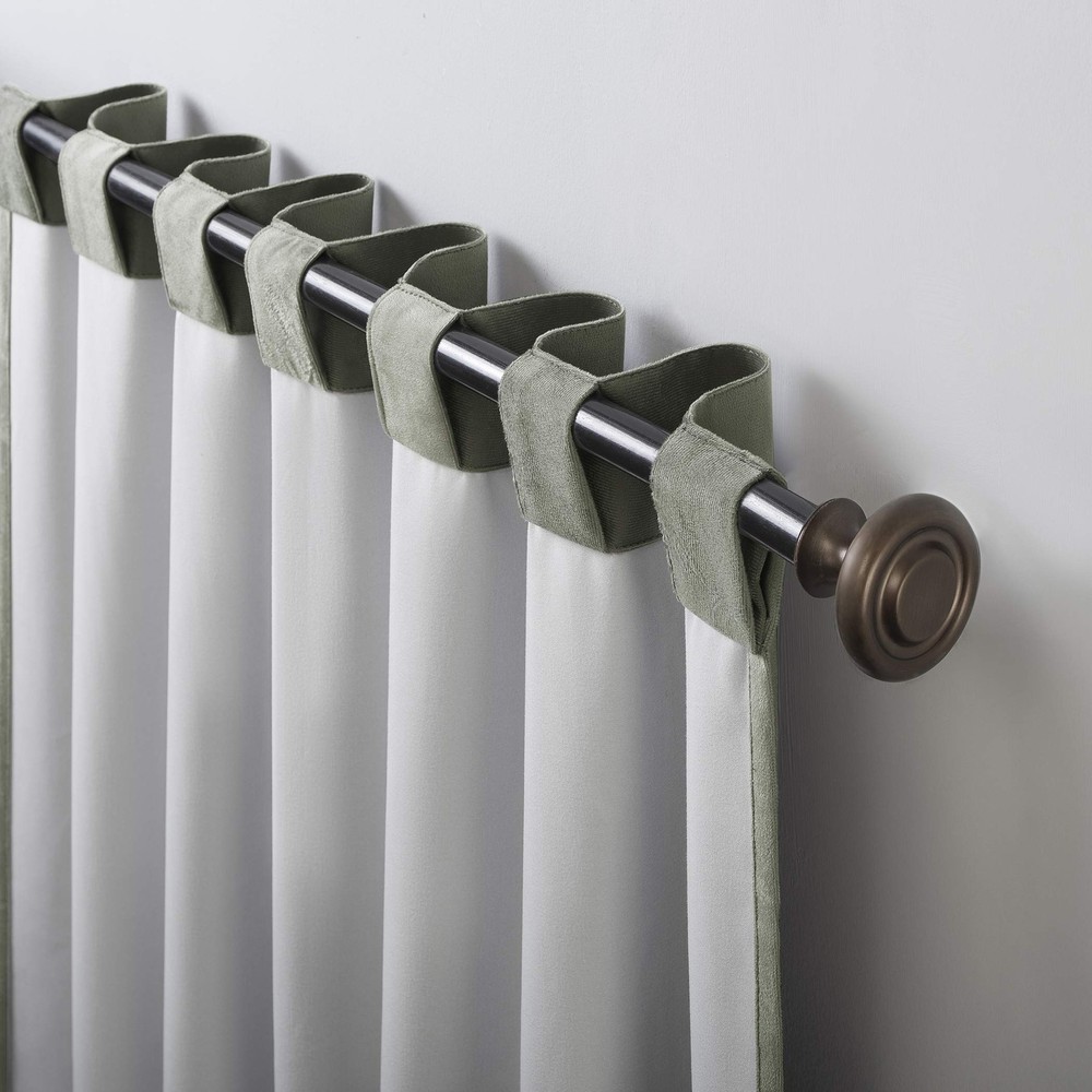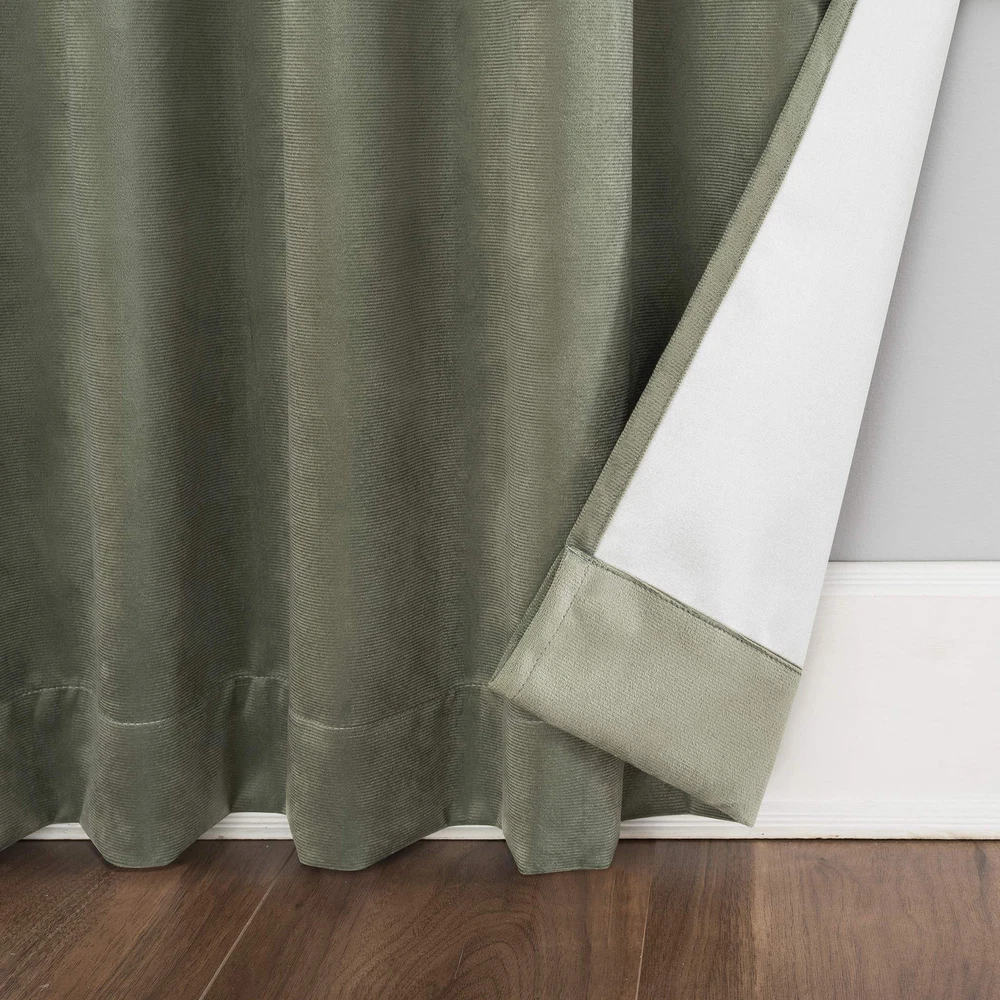 Featuring a decadent velvet fabric, Hampshire Velvet Noise Reducing Thermal Extreme 100% Blackout Back Tab Curtain Panels add luxe appeal to any room of your home. Equipped with back tabs for easy hanging on standard curtain rods up to 1.5" in diameter. Extreme Blackout™ Thermal Lining is laboratory tested to block out 100% of light, reduce outside noise by up to 40%, and decrease energy lost through your windows by up to 40%. Comfort is optimized with thermal properties that help keep summer heat and winter chill out of your home. Built-in back tabs on reverse side allow for easy slide-through installation on curtain rods up to 1.5" in diameter. Hang in your entertainment room to eliminate screen glare and reduce distracting outside noise, or in your bedroom for enhanced privacy and a sounder, more uninterrupted sleep. Sold as individual panels measuring 50" width by 84" length in color moss green. Measure carefully before selecting your desired size and quantity. Rod not included. Machine wash cold on gentle cycle. Use non-chlorine bleach when needed. Tumble dry on low heat, using a cool iron as needed. Decadent velvet fabric in solid tones to effortlessly complement your window space Extreme Thermal Lining reduces outside noise and helps keep summer heat and winter chill out of your home Fits a rod up to 1.5" diameter 100% blackout Panels are sold individually and measure 50" W Noise reduction by up to 40% helps you get a sounder, more uninterrupted sleep back tabs fit curtain rods up to 1.5" in diameter Panels sold individually. Measure carefully prior to purchase. (Image features 2 panels)