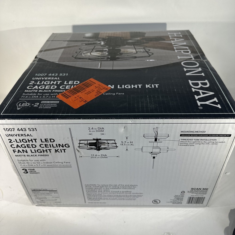 The Hampton Bay Universal 2 Light Caged Ceiling Fan LIGHT KIT ONLY in Matte Black is a stylish and functional addition to any home decor. This kit includes 2 light fixtures designed specifically for Hampton Bay ceiling fans, adding a touch of elegance to your space. The matte black finish enhances the contemporary look of the caged design, ensuring it will complement any design aesthetic seamlessly. Perfect for those looking to upgrade their lighting and create a cohesive, stylish look throughout their home.