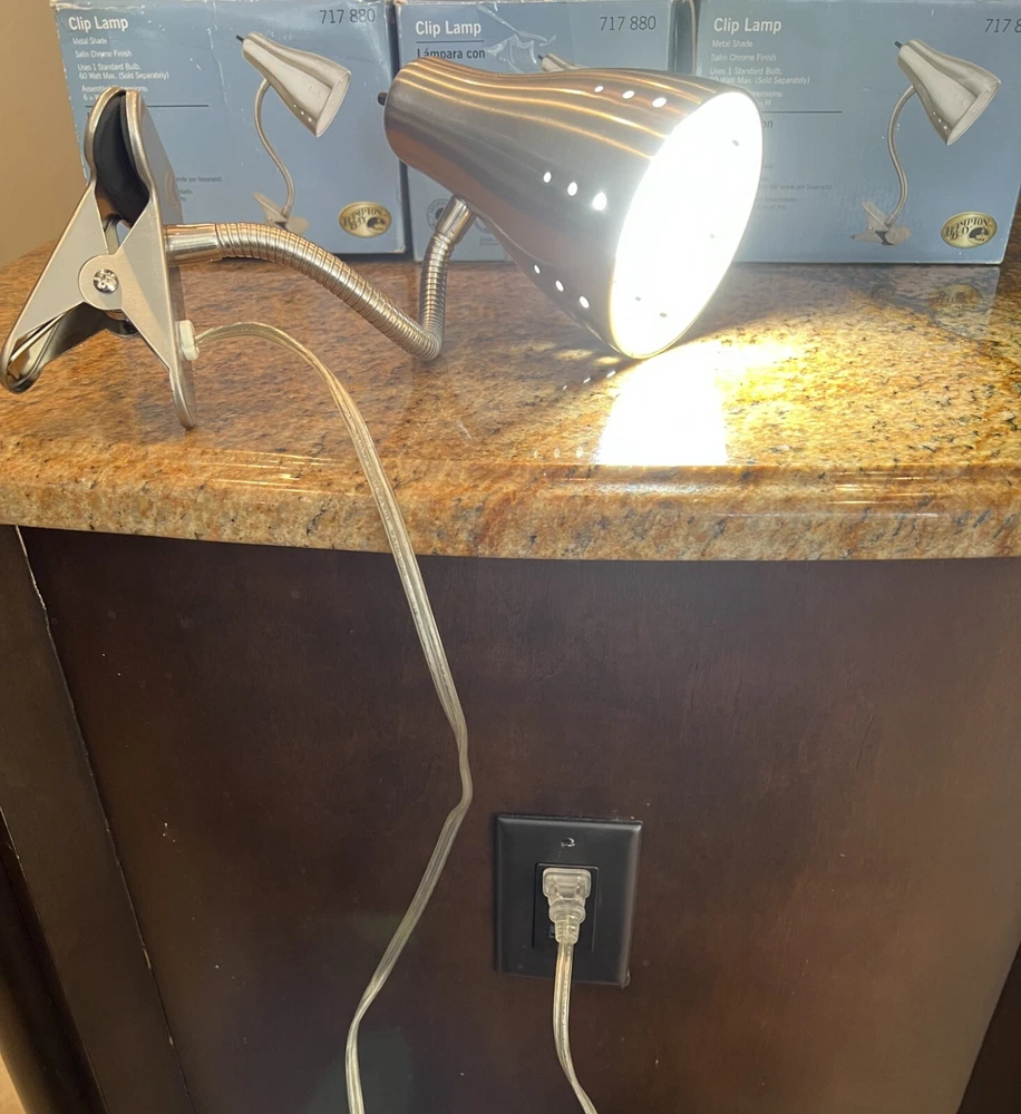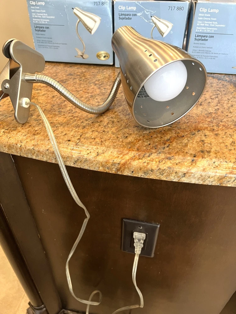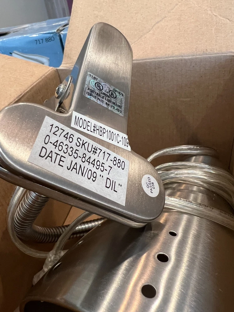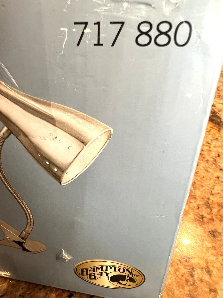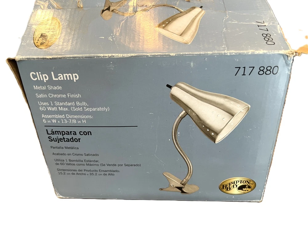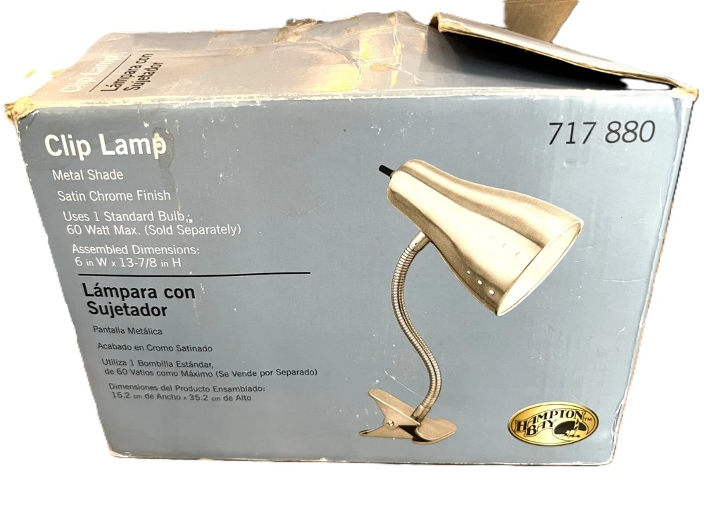 This Hampton Bay Clip Lamp is in excellent working condition in an open box. It was used as craft show lighting, for an average of 8 times per year over a 3-year period. The 60-watt bulb it needs is included. This Clip Lamp has been stored in a pet free and smoke free home. We are committed to fast shipping and outstanding customer service. If there is any issue with your purchase we will do all we can to make it right. Thanks for shopping!