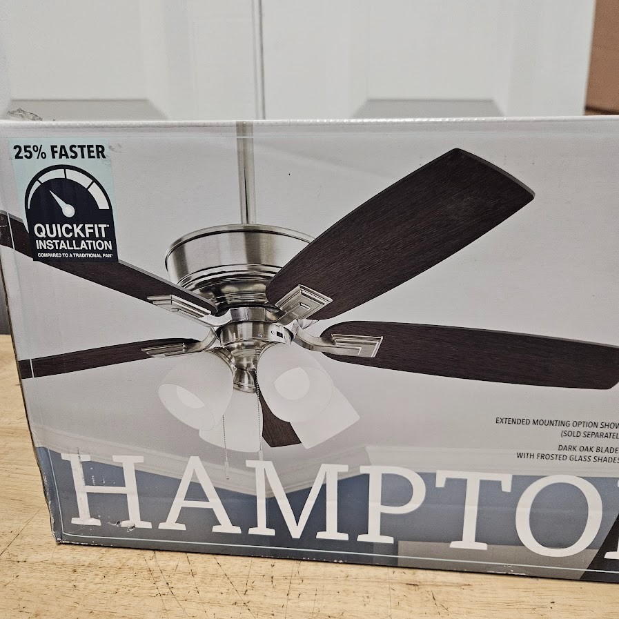 Hampton Bay Devron II 52 in. Indoor Brushed Nickel Ceiling Fan w/ LED Light Kit Highlights 52 in. blade span ideal for medium to large indoor rooms Brushed nickel finish with classic, timeless design Includes (4) 9-Watt LED bulbs for bright, energy-efficient lighting 5 reversible blades in dark oak and stained oak finishes Quick Fit installation system installs up to 25% faster Slide-on mounting bracket for easier setup AccuArm blade arms ensure wobble-free performance Dual-mount installation for standard or angled ceilings Includes 6 in. matching downrod 3-speed reversible motor delivers up to 4,587 CFM airflow Pull chain control for simple operation About This Product The Hampton Bay Devron II 52 in. Ceiling Fan blends traditional elegance with modern installation features and reliable performance, making it a great addition to a variety of indoor spaces. Finished in brushed nickel and paired with reversible blades in dark oak and stained oak, this fan offers versatile styling to match your décor. Designed for convenience, the Quick Fit installation system—including Quick Install blades, a slide-on mounting bracket, and AccuArm blade arms—reduces installation time while ensuring a secure, wobble-free setup. The included 6-inch downrod supports proper airflow and flexible mounting options, including angled ceilings. The integrated 4-light kit provides maximum illumination and includes four energy-efficient 9-Watt LED bulbs, offering long-lasting performance while reducing energy consumption. The 3-speed reversible motor delivers up to 4,587 CFM, allowing you to cool your space in the summer and circulate warm air during colder months. With its combination of classic design, efficient lighting, and easy installation, the Devron II ceiling fan is a dependable and stylish upgrade for living rooms, bedrooms, and more. We take great care to inspect all items and ensure they are accurately described. Should you have any issues with your purchase, please let us know immediately. We are committed to resolving any concerns promptly and to your satisfaction. Our small business truly appreciates your patronage. hampton bay ceiling fan 52 inch ceiling fan brushed nickel ceiling fan indoor ceiling fan with light LED ceiling fan reversible blade ceiling fan traditional ceiling fan pull chain ceiling fan 5 blade ceiling fan living room ceiling fan bedroom ceiling fan energy efficient ceiling fan home ceiling fan fixture
