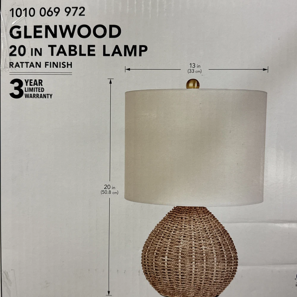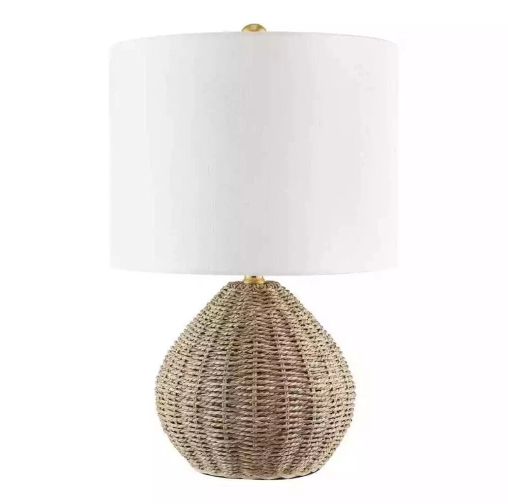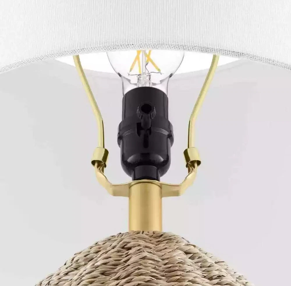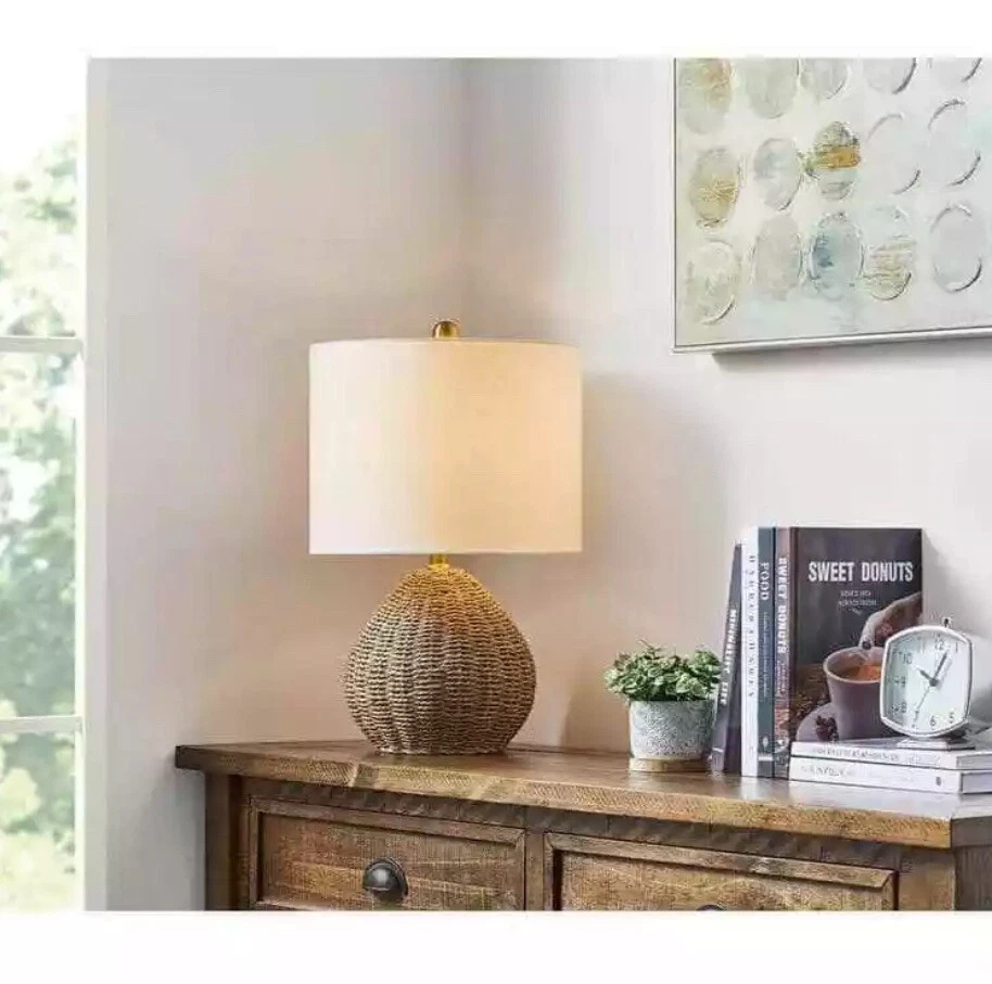 About This Product This woven table lamp with a rotary switch highlights both coastal and bohemian designs. At 20 in. tall, our rattan table lamp is the perfect addition to any entryway or living room. Its lightly colored cotton shade complements the rattan base, adding a traditional yet rustic touch to any space. Traditional brown woven base with a white cotton drum shade and brass gold accents Brass gold rotary switch, this lamp adds a classic touch to any space Bohemian touches include not just the rattan woven lamp base but also the traditional cotton shade Includes an elegant, clear, plastic cord of 60 in. L Complement the room with the glorious gold interior harp and finial behind the lampshade Compatible with the maximum wattage of a type a 100-Watt or LED 16-Watt bulb Drum-shaped cotton fabric shade with a gourd-like rattan body