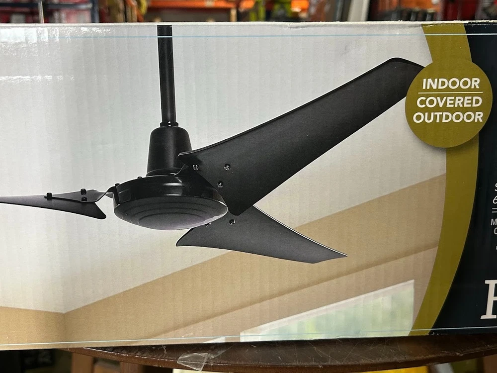 Hampton Bay Industrial 60" Indoor/Outdoor Ceiling Fan | Black w/ Wall Control & Reversible Motor About This Item Bring powerful, efficient air circulation to large indoor or covered outdoor spaces with the Hampton Bay Industrial 60 in. Ceiling Fan. Designed with a high-performance 194 RPM motor and three durable ABS blades, this fan delivers up to 9,999 CFM of airflow—ideal for great rooms, workshops, warehouses, patios, and other expansive areas. The included wired wall-mount control lets you easily select from four speed settings, while the reversible motor supports year-round comfort by pushing warm air down in winter and creating a cooling breeze in summer. Finished in sleek black, this industrial-style fan complements modern, commercial, and utility-inspired spaces. Key Features Powerful 4-speed reversible motor for year-round comfort Delivers up to 9,999 CFM airflow for large 20 ft. x 20 ft. areas and beyond Modern industrial design with black finish and matching ABS blades Wired wall-mount control included for convenient speed selection High-efficiency blade pitch for superior air movement Damp-rated for covered outdoor areas such as porches and patios Includes 6 in. downrod for standard mounting Ideal for workshops, garages, vaulted spaces, basements, great rooms, and more 24 in. lead wire for flexible installation Our Guarantee We take great care to inspect all items and ensure they are accurately described. Should you have any issues with your purchase, please let us know immediately. We are committed to resolving any concerns promptly and to your satisfaction. Our small business truly appreciates your patronage. hampton bay industrial ceiling fan 60 inch indoor outdoor black wall control reversible motor high cfm commercial fan workshop garage patio damp rated modern industrial air circulation large room fan