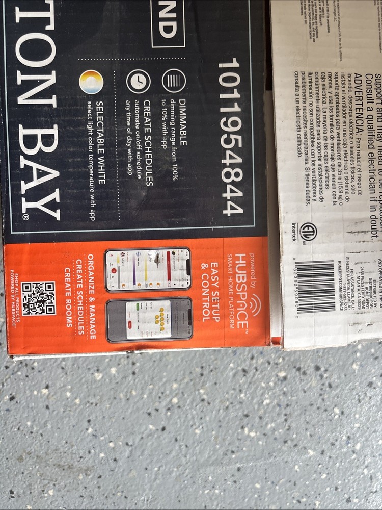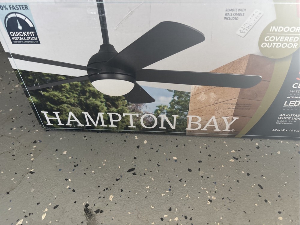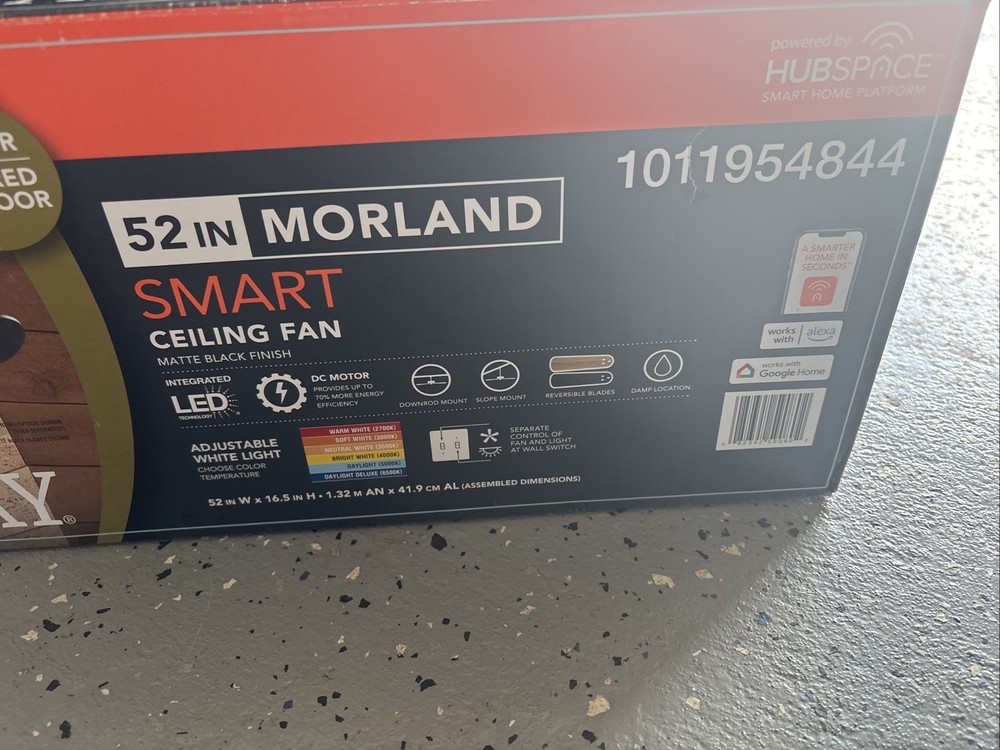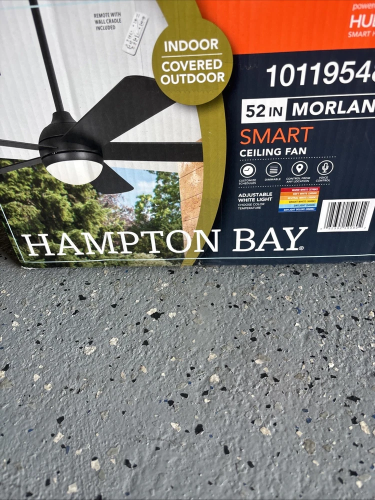 The Hampton Bay Morland 52" Smart Matte Black Indoor Outdoor Ceiling Fan with LED lights and remote control is a modern and stylish addition to any room. With a steel housing and a DC motor, this fan offers efficient and powerful airflow with a maximum motor speed of 160 RPM. The fan features a 6-speed control, remote access, and adjustable white LED lighting technology, making it suitable for both indoor and outdoor spaces. The fan is designed for large rooms and has a sleek matte black finish with black and brown blades, adding a touch of sophistication to any space. Bought from a pallet for resale box looks open nothing untouched few minor dents inbox. Everything is in the box sold as is.