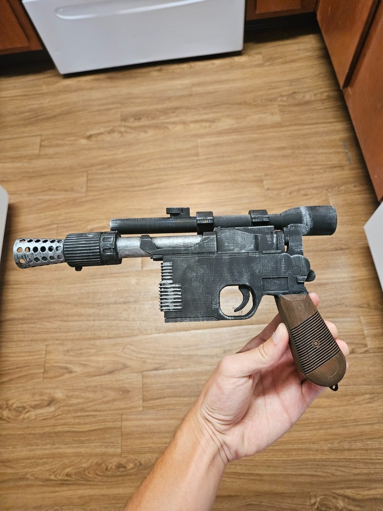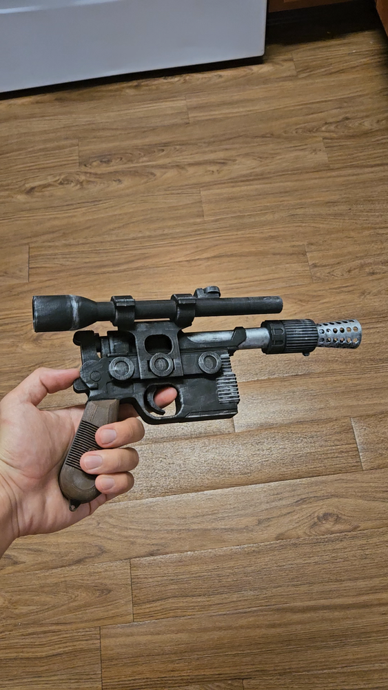 Han Solo Blaster DL-44 Replica This Han Solo Blaster DL-44 replica is a must-have for any Star Wars fan. Inspired by the iconic weapon from Star Wars: Episode IV – A New Hope, this full-size replica is hand-painted, and designed with incredible attention to detail. The custom weathered paint finish gives it the look of worn metal, making it a standout piece in any collection. Perfect for both display and cosplay, this blaster captures the spirit of the galaxy’s most legendary smuggler. It is not a vintage item and has not been signed, but it’s sure to delight fans of Han Solo and the Star Wars universe. Whether as a collector’s centerpiece, a gift, or for Star Wars Celebration, this replica is an amazing addition for any sci-fi enthusiast. Items Included: Han Solo Blaster DL-44 replica