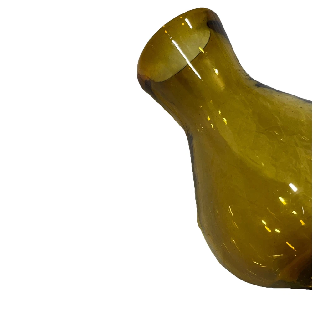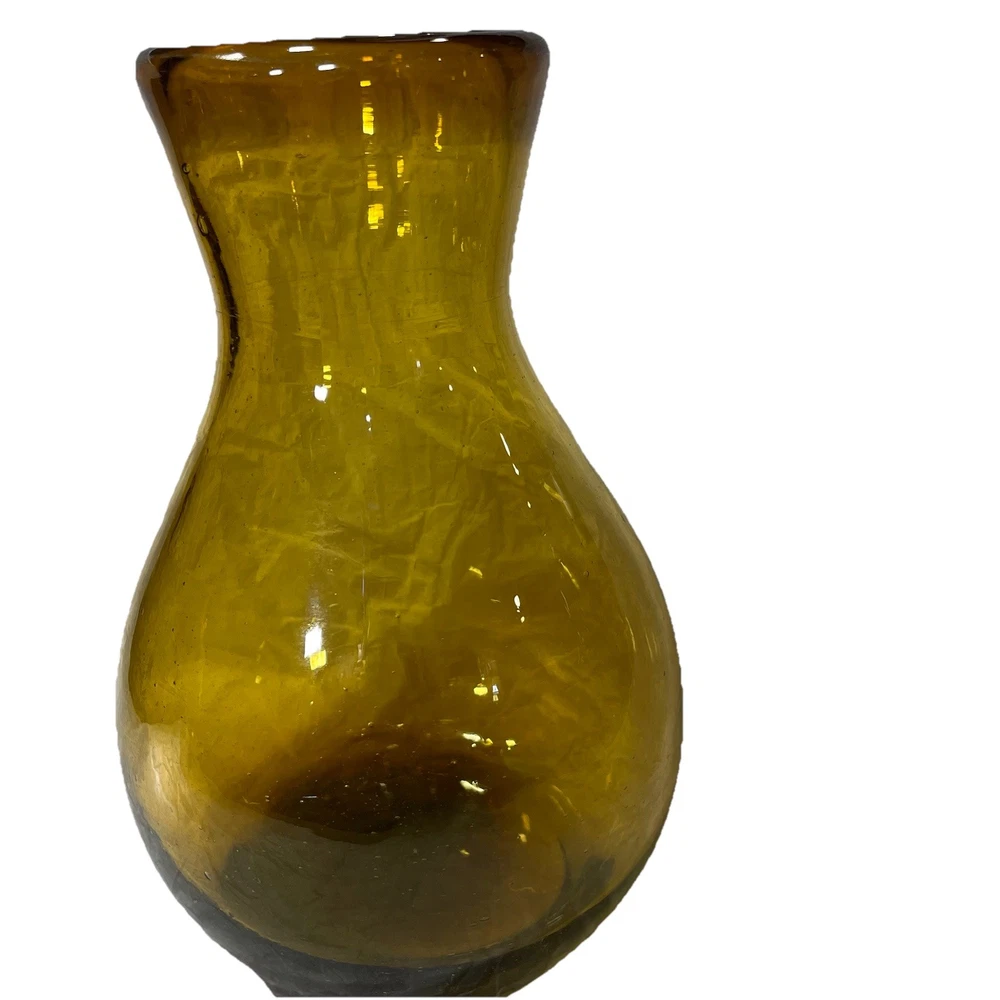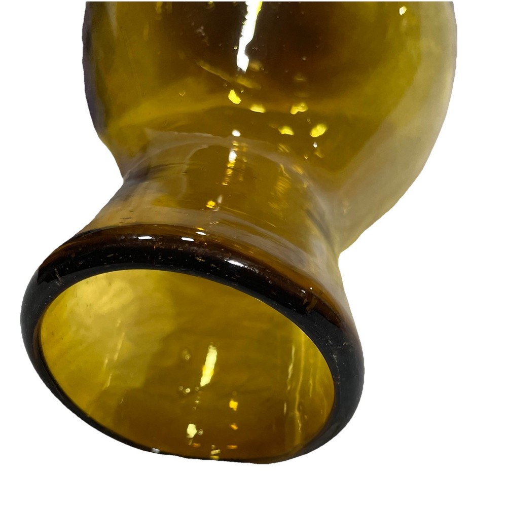 This hand-blown glass vase in amber is a modern and decorative piece perfect for any room in your home. Its round shape and unique handcrafted design add an artistic touch to your space. Made of glass with a beautiful amber color, this vase is easy to clean with hand wash only instructions. Add a touch of elegance to your living space with this stylish and eye-catching piece that is sure to be a conversation starter.
