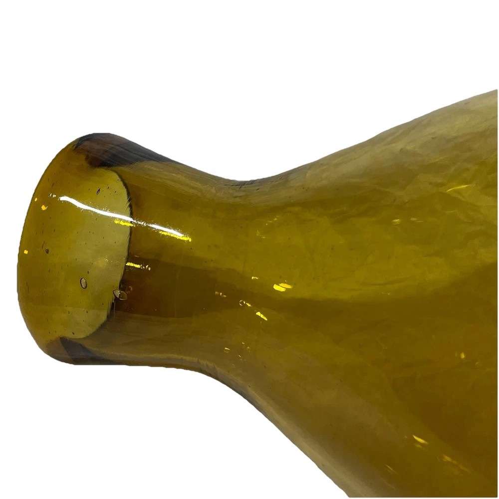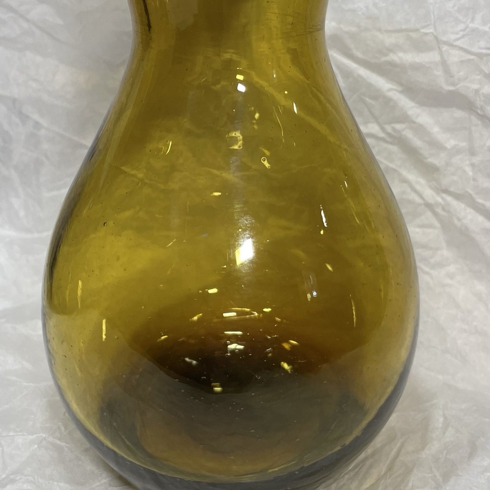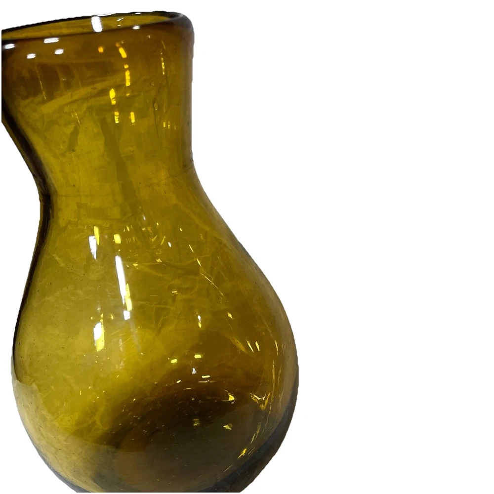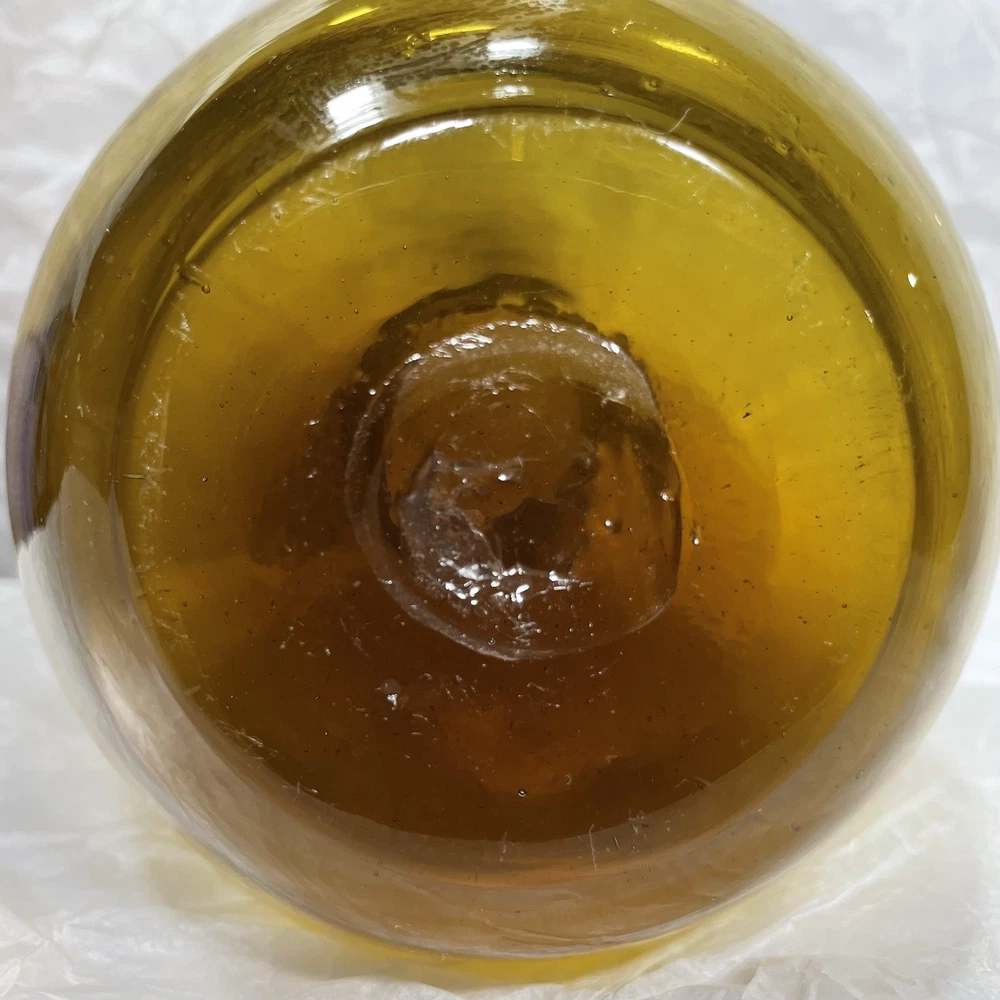 This hand-blown glass vase in amber is a modern and decorative piece perfect for any room in your home. Its round shape and unique handcrafted design add an artistic touch to your space. Made of glass with a beautiful amber color, this vase is easy to clean with hand wash only instructions. Add a touch of elegance to your living space with this stylish and eye-catching piece that is sure to be a conversation starter.
