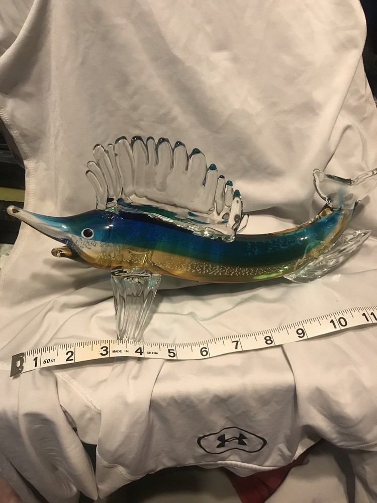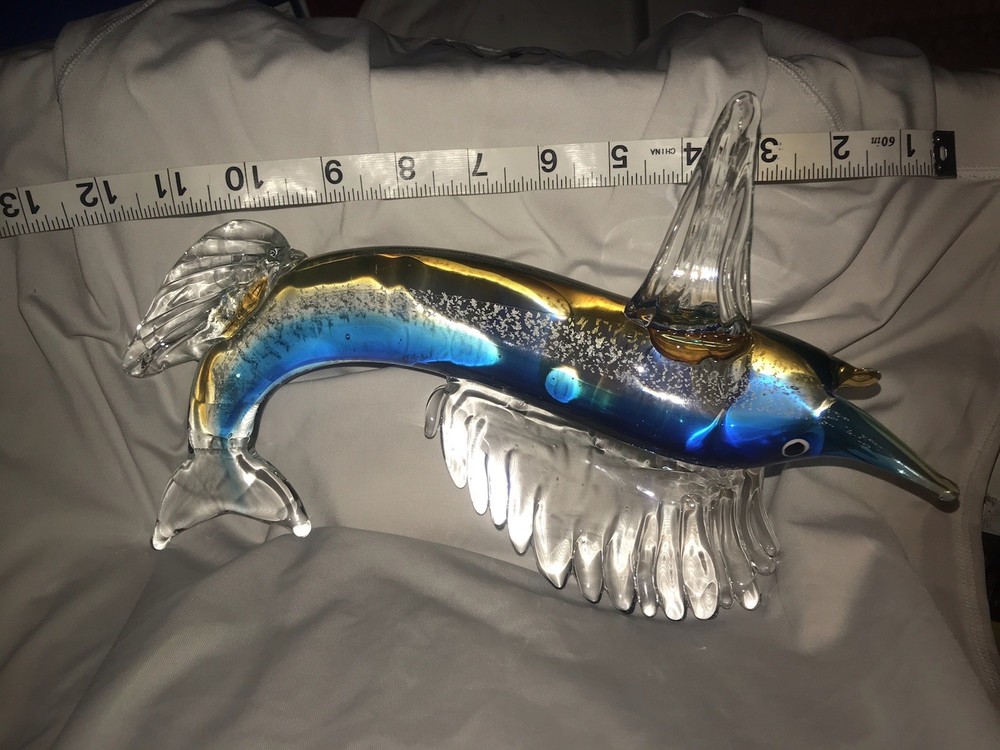 This hand-blown glass marlin fish is a unique and artistic decorative collectible. Crafted from glass with meticulous attention to detail, this original piece adds a touch of elegance and sophistication to any space. The marlin fish design, created through the meticulous process of blowing glass, makes it a standout piece for collectors or those looking to enhance their decor with a one-of-a-kind item.
