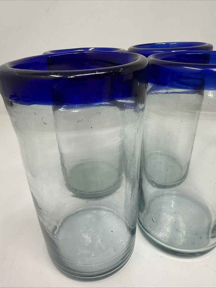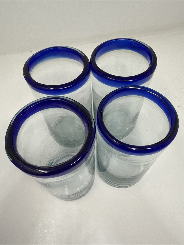 Theme: Food & Drink Occasion: All Occasions Country/Region of Manufacture: Mexico Material: Glass Number of Items in Set: Four-Piece Glassware Type: Glassware Set Set Includes: Tumbler Bundle Description: Set of 4 Color: Blue Brand: Unbranded Service For: 4 Type: Tumbler Features: Hand Blown, Cobalt Blue Rim Custom Bundle: Yes