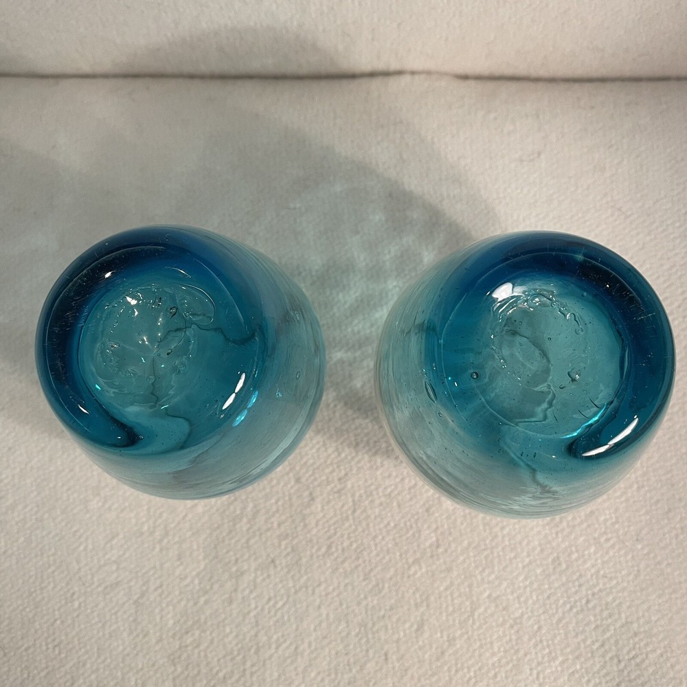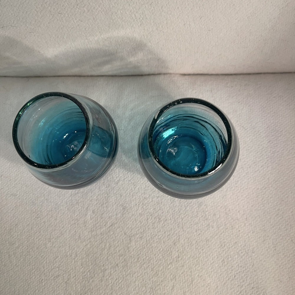 This set includes two teal/aqua glass votive holders suitable for mini candles. Each holder is round in shape with a contemporary style, featuring a hand-blown glass construction from the 1990s. The all-over pattern showcases a vibrant teal/aqua color, with the top width measuring 4.5 inches and the middle width at 3.5 inches. The item stands at a height of 4.5 inches and has a total weight of 1.11 lbs. Perfect for adding a touch of elegance to any space, these votive holders are a stylish and unique addition to your decor. Excellent condition . No chips or cracks.