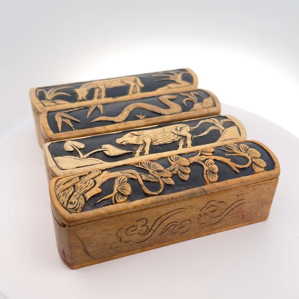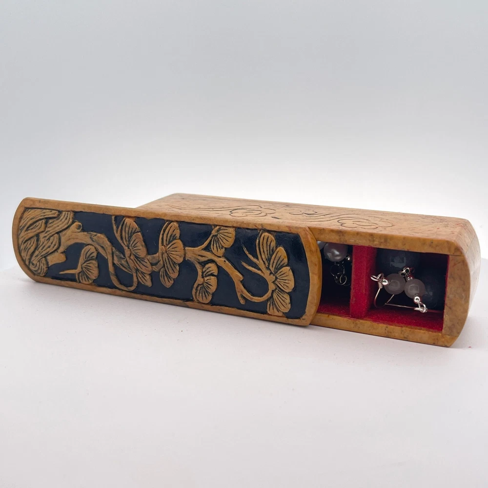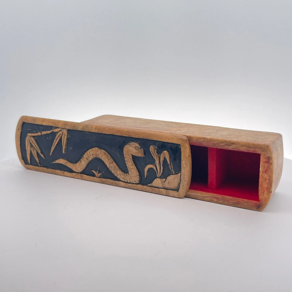 This unique hand-carved stone jewelry box features traditional animal and floral motifs inspired by nature and Vietnamese folk art. With its elongated design and red velvet-lined interior, it’s ideal for storing bracelets, malas, or precious keepsakes. 🐍 Nature & Animal Symbolism – Featuring elegant carvings of animals like snakes, birds, and buffalo, symbolizing wisdom, peace, and harmony. Material: Hand-carved from solid natural stone with contrasting black and beige tones. πŸ“ Dimensions: 4 x 1.2 x 1.2 inches. βš–οΈ Weight: 132 grams – slim, sturdy, and travel-friendly. πŸ–οΈ Artisan-Made in Vietnam – Crafted by skilled hands, each box is one of a kind. πŸ’ Perfect for Jewelry & Charms – Ideal for rings, bracelets, beads, pendants, or prayer items. 🎁 Cultural & Functional Gift – A distinctive gift for nature lovers, spiritual seekers, or collectors of handmade art. This is more than a box – it’s a story carved in stone, carrying the spirit of tradition and care. *Contact us for more questions - VietsWay *