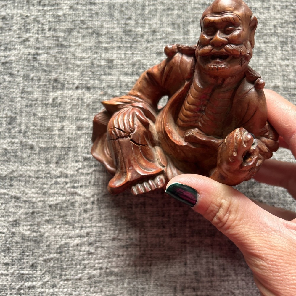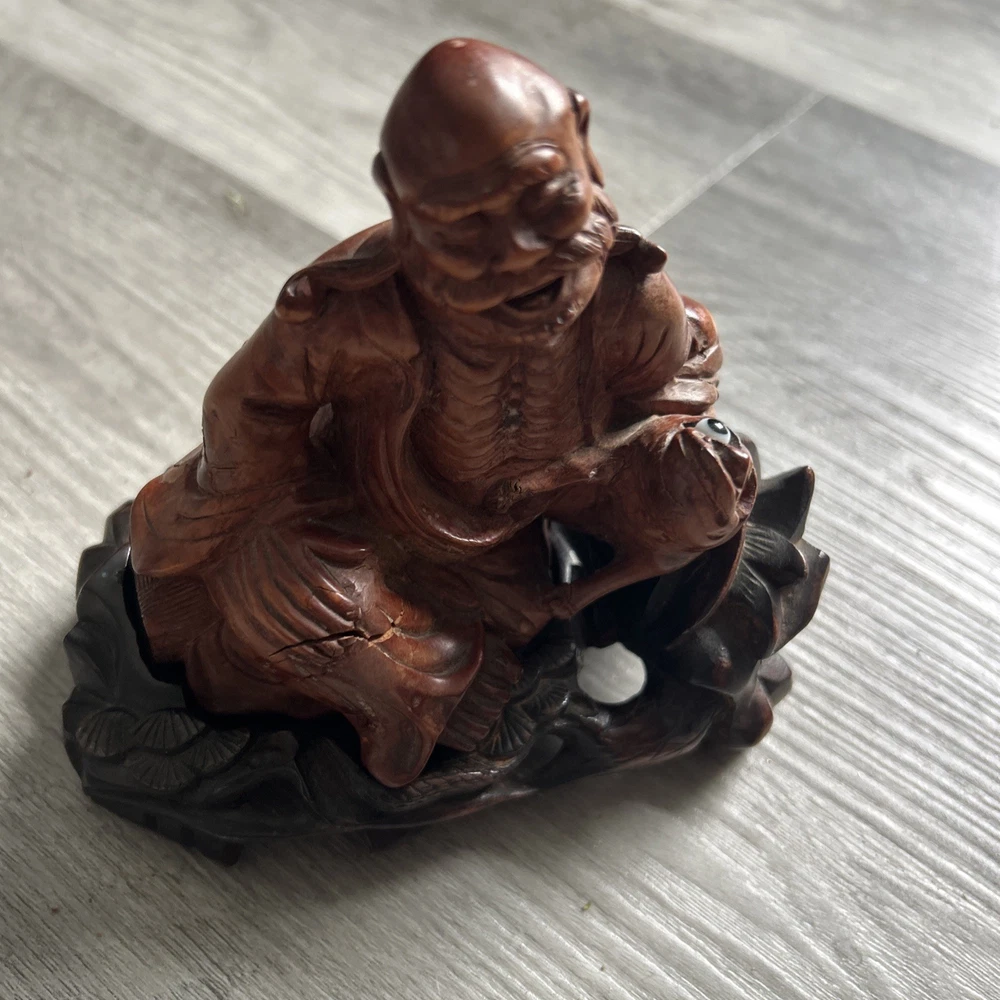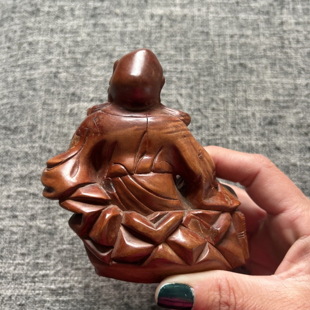 This hand-carved teak wood Laughing Buddha statue is a unique and beautifully crafted piece that represents Buddhism and spirituality. The statue features intricate details, with the Laughing Buddha holding a fish in one hand, symbolizing happiness and abundance. Made with care and precision, this handmade collectible is a beautiful addition to any home, especially for those who appreciate religious art and craftsmanship. Please see photos NOT in pristine condition