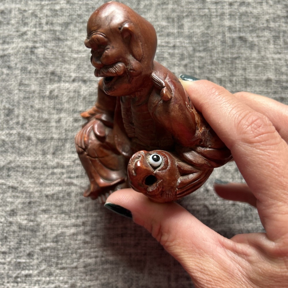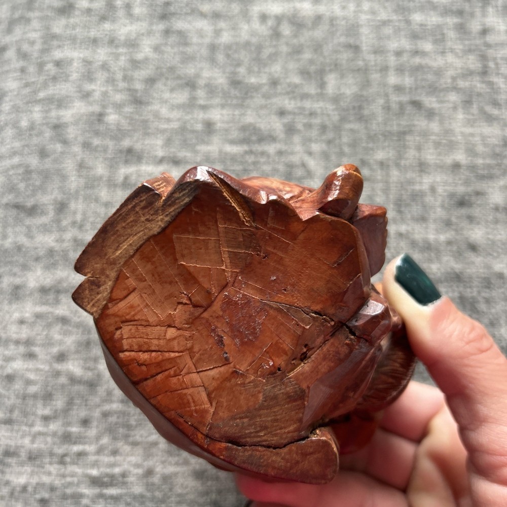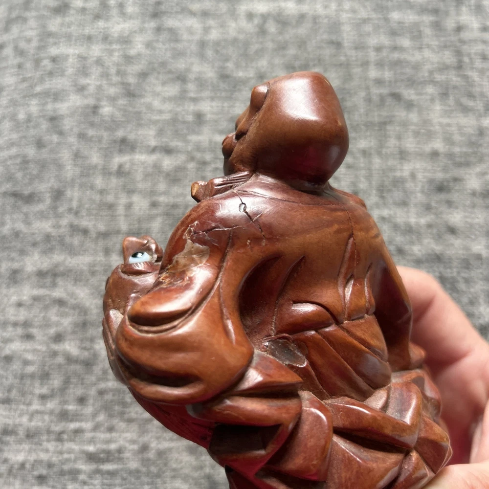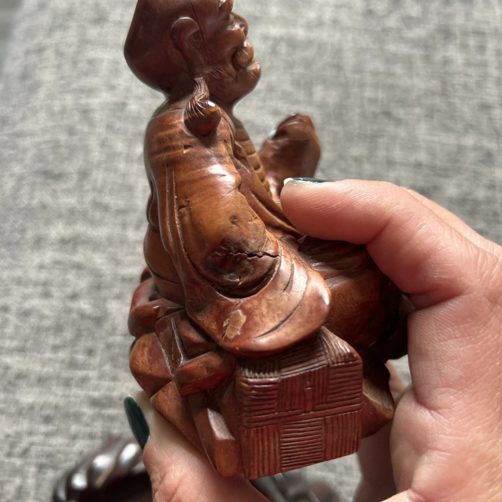 This hand-carved teak wood Laughing Buddha statue is a unique and beautifully crafted piece that represents Buddhism and spirituality. The statue features intricate details, with the Laughing Buddha holding a fish in one hand, symbolizing happiness and abundance. Made with care and precision, this handmade collectible is a beautiful addition to any home, especially for those who appreciate religious art and craftsmanship. Please see photos NOT in pristine condition