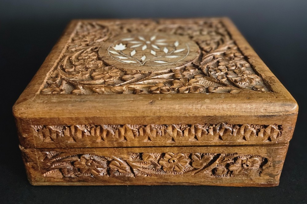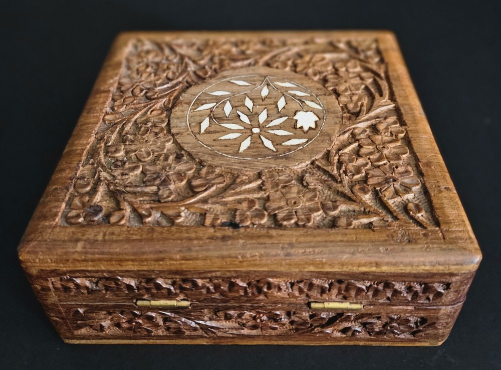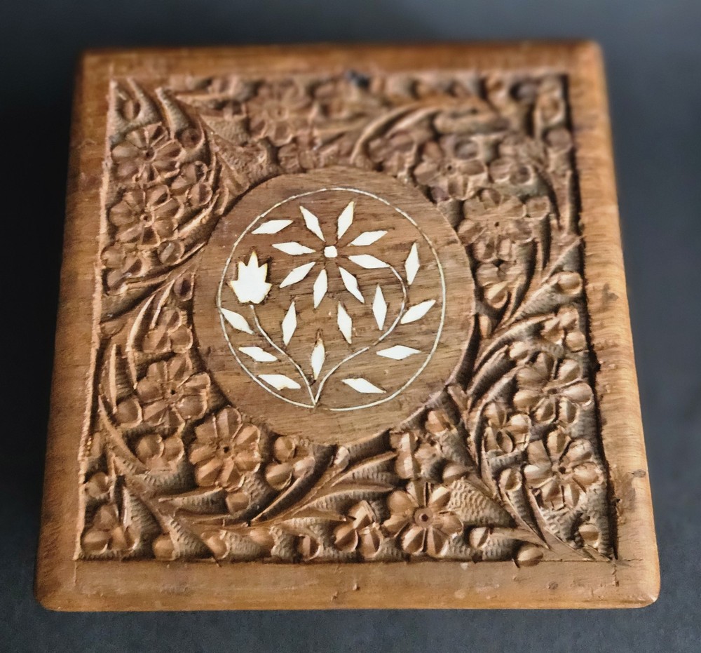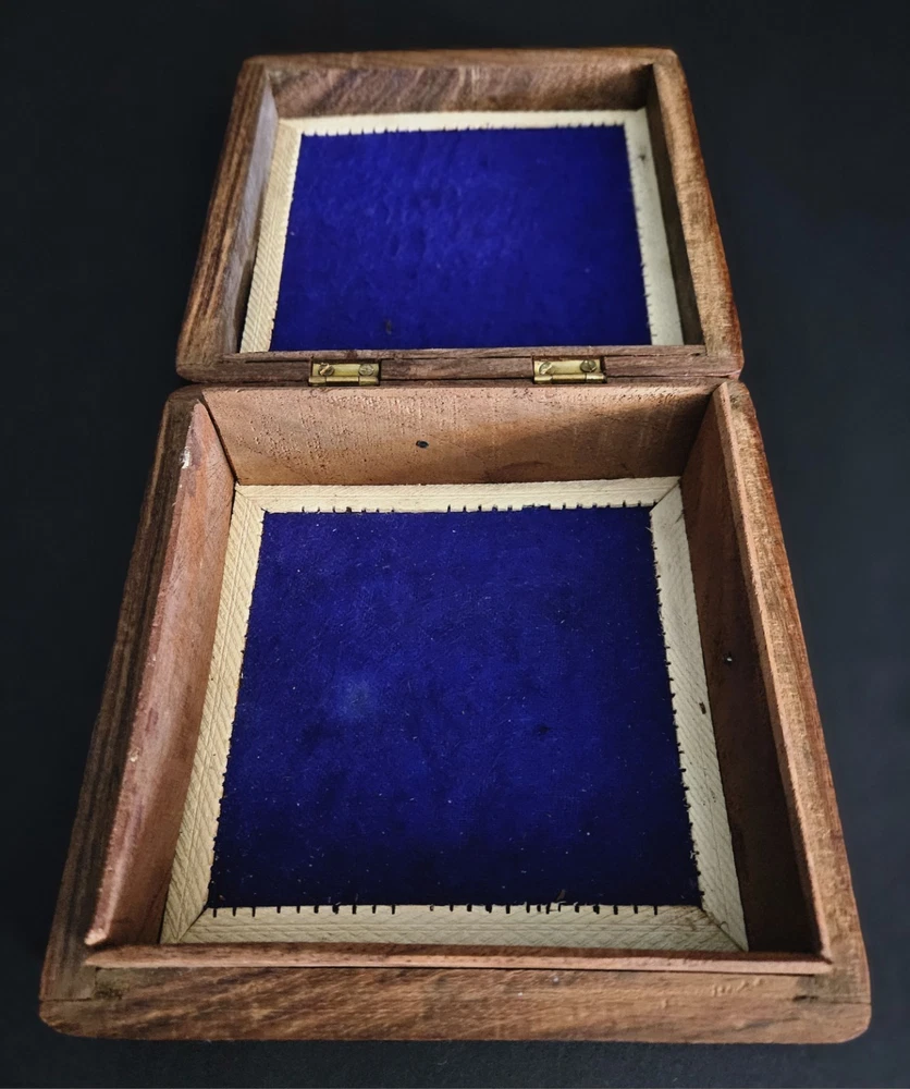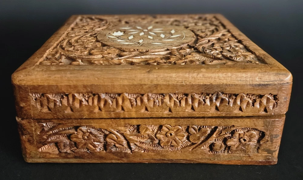 Care Instructions: Clean with Damp Cloth Subject: Boxing Size: Medium Room: Any Room Finish: Stained Engraved: Yes Item Length: 6" Closure Type: Hinged Lidded Original/Reproduction: Original Time Period Manufactured: 1990-1999 Material: Wood Item Height: 2.25" Color: Multicolor Brand: Wooden Production Technique: Job Production Era: Late 20th Century (1970-1999) Collection: Keepsake Boxes Item Weight: 1 lb Country of Origin: India Style: Bohemian Customized: No Occasion: All Occasions Department: Adults, Teens, Girls, Boys, Kids Type: Keepsake Box/ Jewelry Box Number in Pack: 1 Year Manufactured: 1990 Handmade: Yes Item Width: 6" Pattern: Floral Shape: Square Theme: Flowers Features: Carvings Packaging: Unboxed
