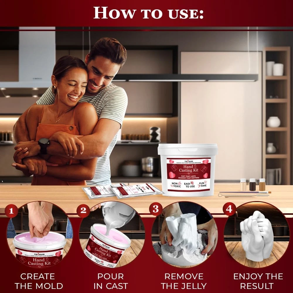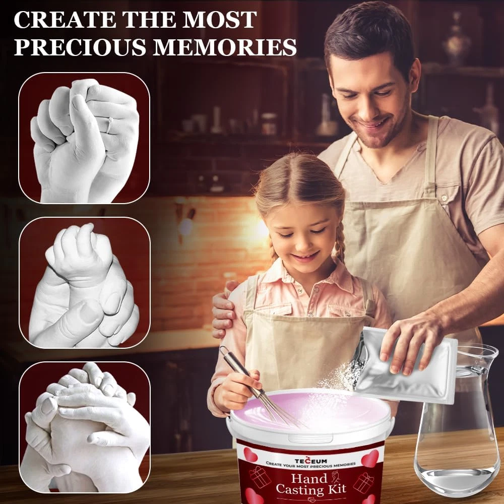 πππ‘π π π’ππ ππ’π¨π£πππ¦ π¦πππ. This set fits perfectly for two adult or children's hands and includes everything you need to create a flawless plaster figure: L size Molding Bucket, Alginate Molding Powder (700 g), Casting Stone Powder (1100 g), 2 Sandpapers, 2 Detailing Sticks, Table cover, Detailing pin, Spoolie Brush, Instruction booklet. πππ£π§π¨π₯π ππ π£π’π₯π§ππ‘π§ π π’π ππ‘π§π¦. With a hand casting kit, you can turn important moments into tangible keepsakes. Whether it's the tiny hand of a newborn, the clasped hands of a loving couple, or the bonds of family, these casts freeze time and capture the essence of the moment. Enjoy the sculpture through the years. πππ¦π¬ π§π’ π¨π¦π. You don't need to be an artist to create a work of art. The set contains all the necessary stuff. Simply follow the instructions to create a detailed and personalized hand mold. This is an exciting way to spend quality time with your loved ones and to enhance your relationships. You can proudly display the finished result on a shelf at your home. πͺπ πππ₯π. Our non-toxic molding powder is manufactured in compliance with all standards, ensuring that the process of recording your memories is as safe as it is beautiful. So, you can create lasting treasures from the hands of your loved ones with confidence that your health and well-being are our top priority. π¨π‘ππ€π¨π ππππ§. Looking for a unique sentimental gift idea for a special date? The Hand Casting Kit is a perfect solution! This can be an especially cool gift for holidays such as Christmas, Wedding, Valentineβs Day, Motherβs Day, Birthday and for those who have everything. Itβs also a perfect date night idea for boyfriend & girlfriend, wife & husband, him & her. Our craft sets are suitable for the hands of men, women and children of all ages and even pets. Product Description