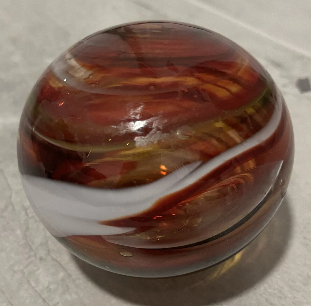 This beautiful glass ball was meticulously handcrafted in Oregon, showcasing a stunning swirl pattern in multicolored hues. The ball is a unique and eye-catching piece of art glass, perfect for adding a touch of elegance to any space. Its mid-century modern style and decorative features make it a perfect paperweight or display item. The ball is made of high-quality glass and is an original, licensed reproduction from the 21st century. Its production style is hand-blown glass, highlighting the craftsmanship and skill of the artist. This item is a must-have for any collector or lover of decorative art. Around 6 in diameter and around 6 in tall. Calculation may vary.