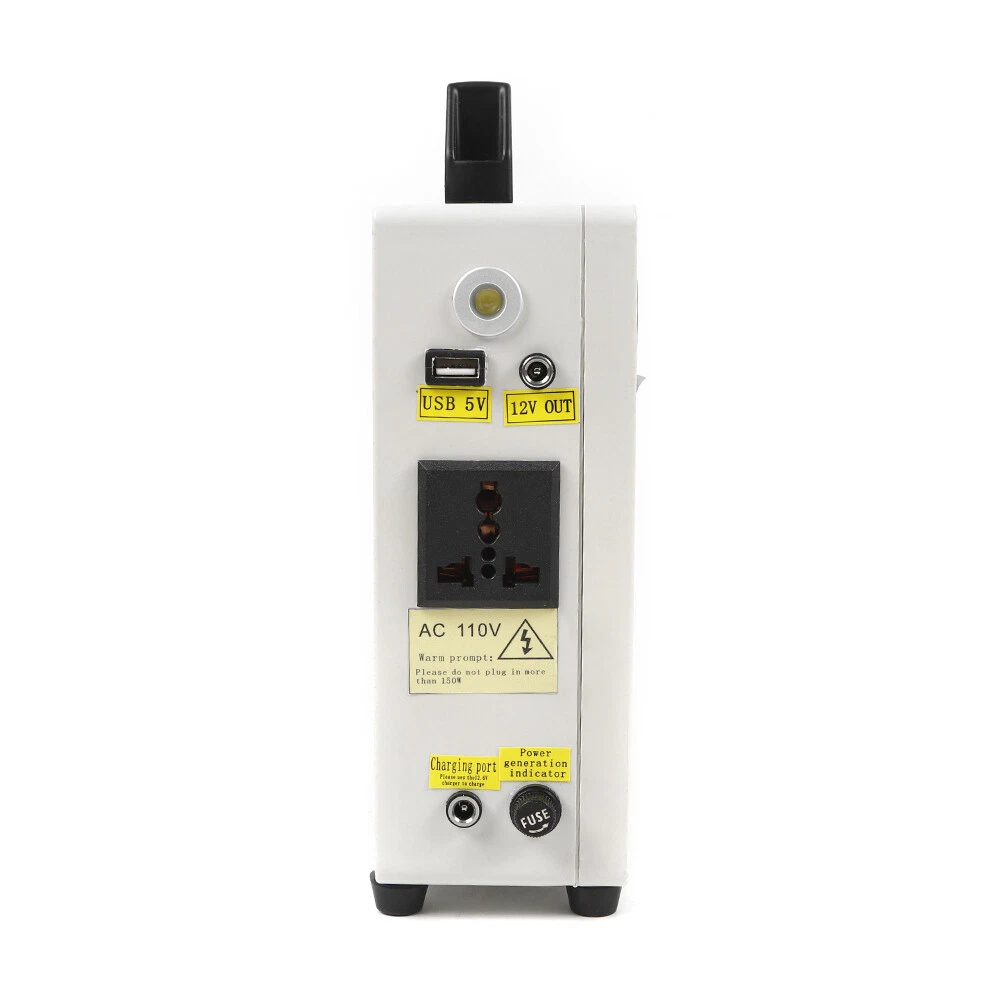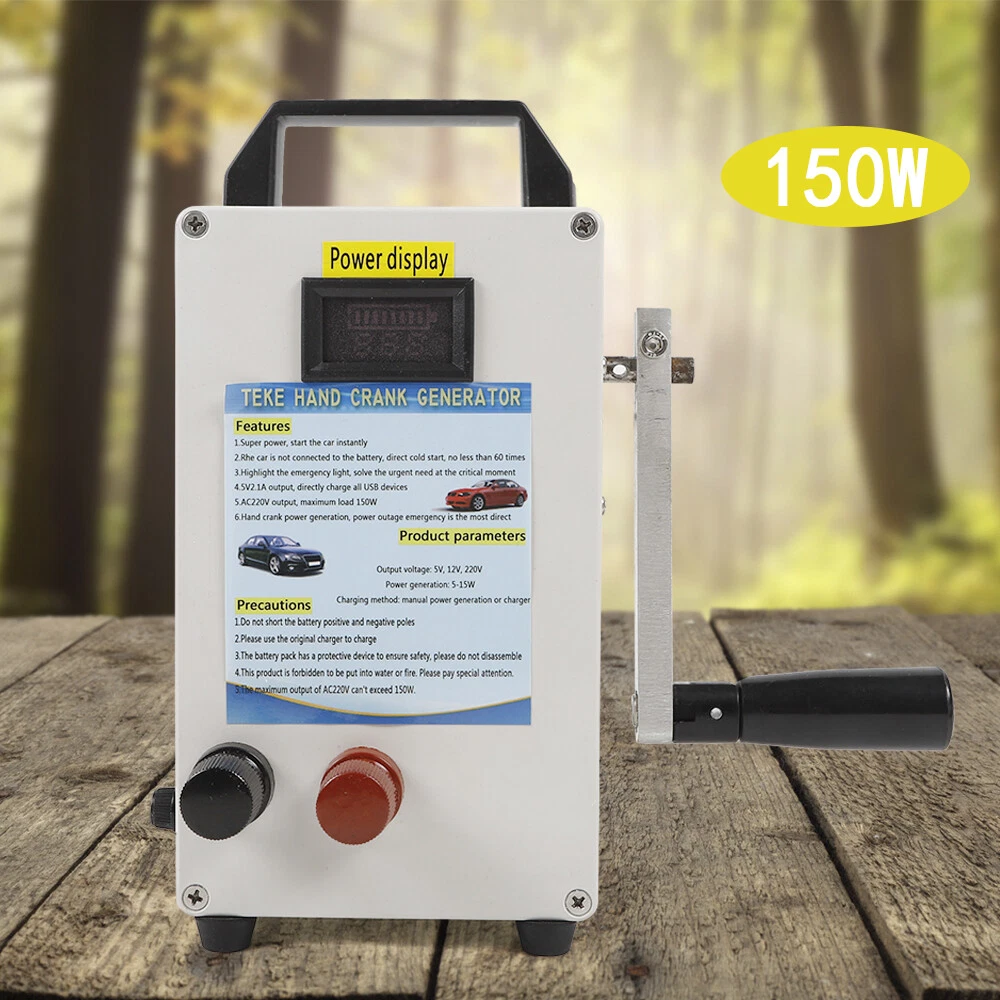 Hand Crank Generator Emergency Power Supply USB Charger Camping Outdoor Survival CE-WMTZXL-785 Hand Crank Generator phone Charger portable Portable Emergency power supply Application: Travel emergency power,Mobile phone charging,Laptop charging,lighting source,electric appliance of 150W,Base station emergency power supply,Outdoor small electric drill power supply Specifications: Item:Emergency hand generator Model: TK150W-C Input voltage: DC11-15V output voltage: USB---5V 2.1A; DC12V; AC110V(sinusoidal wave) Storage method:Municipal power storage (emergency); Hand-operated power generation and storage (15W)---Transmission motor for Speed is slow,The output current is up to 1A Solar energy storage Inverter power:150W Inverter features:Inverter efficiency: 95.4% Product size:200*120*60mm Product weight:1.35KG Hand-operated power generation and storage parameters: 80 round per minute---Motor speed 300 revolutions,output: 12.5V 8.75W 0.7A 90 round per minute---Motor speed 500 revolutions,output: 18.9V, 17.01W 0.9A 130 round per minute---Motor speed 1200 revolutions,output:24.8V ,29.76W 1.2A Features: When hand power is generated, the output indicator is bright, and both positive and negative Product configuration of the power display device can directly s ee the storage voltage and power The handle of the product is made of aluminum alloy, which can be folded and never rusted. Both the input port and the output port are international standard LED indicating lamp,Under - pressure, over pressure, over flow,Over temperature short circuit indication Note: This product is forbidden to be put into water or fire. Please pay special attention. The maximum output of AC220V can't exceed 150W. Packages: 1 x Hand Crank Generator CE-WMTZXL-786 Hand Crank Generator phone Charger portable Portable Emergency Power Supply Application : Travel emergency power , Mobile phone charging , Laptop charging , lighting source , electric appliance of 150W , Base station emergency power supply , Outdoor small electric drill power supply Specifications : Item : Emergency hand generator Input voltage: DC11-15V output voltage : USB---5V 2.1A; DC12V; AC110V(sinusoidal wave) Storage method : Municipal power storage (emergency); Hand-operated power generation and storage (15W)---Transmission motor for Speed is slow , The output current is up to 1A Solar energy storage Charging method: manual power generation or charger Inverter power : 150W Inverter features:Inverter efficiency: 95.4% Built-in insurance:15A×1 low air pressure alarm:10.5±1V Low pressure off:10.5V±1V Over voltage protection:15.6V±1V no-load consumption:12V no-load current :≤0.1A no-load power:<2W peak power : (150W) Product size:200*12*60mm Product weight:1.35KG Hand-operated power generation and storage parameters: 80 round per minute---Motor speed 300 revolutions , output : 12.5V 8.75W 0.7A 90 round per minute---Motor speed 500 revolutions , output : 18.9V , 17.01W 0.9A 130 round per minute---Motor speed 1200 revolutions , output : 24.8V ,29.76W 1.2A Features : When hand power is generated, the output indicator is bright, and both positive and negative Product configuration of the power display device can directly s ee the storage voltage and power The handle of the product is made of aluminum alloy, which can be folded and never rusted. Both the input port and the output port are international standard LED indicating lamp , Under-pressure, over pressure, over flow , Over temperature short circuit indication Super power, start the car instantly T he car is not connected to the battery, direct cold start, no less than 60 times Highlight the emergency light, solve the urgent need at the critical moment 5V , 2.1A output, directly charge all USB devices AC 11 0V output, maximum load 150W Hand crank power generation, power outage emergency is the most direct Note: Do not short the battery positive and negative poles Please use the original charger to charge The battery pack has a protective device to ensure safety, please do not disassemble This product is forbidden to be put into water or fire. Please pay special attention. The maximum output of AC220V can't exceed 150W. Packages: 1 x Hand Crank Generator Payment Delivery details Terms of sales About us Contact us Payment We accept ebay payment 。 Fees such as import duties, taxes are not included in the item price or shipping costs. These charges are the buyer's responsibility. Delivery details Shipping: 2-9 working days to: USA Terms of sales We maintain high standards of excellence and strive for hundred percent customer satisfaction. Feedback is very important to us. We hope that you contact us immediately before you give neutral or negative feedback, so that we can address your concerns. It is impossible to address issues if we do not know about them! About us Your satis faction is our ultimate goal. We work hard to earn your trust and future business. Our certified technicians have tested each item before shipping. The unit comes with 1 year limited warranty on all manufacturing defects. a) If you receive a defective item, you may return it or ask for a discount. Please contact us within 14 days after you receive the package. b) What you returned must be intact and in its original packaging as re? u. Customer is responsible for shipping costs of the returned item. c) We will cover the cost of shipping back t with the shipping rate indicated in the registration page. We will send you a new unit or refund the full payment you paid. Thank you. Contact us Business Hour Business Hour: Monday To Friday: 8:30 AM to 5:00 PM (Beijing China time) Due to time zones, our reply to your questions may not be immediately. But within above working time, we will reply your email within 24 hours. If it's non-workdays, please kindly be patient and wait till Monday. Please contact us with ebay message. Please feel free to contact us if you have any questions. Monday To Friday: 8:30 AM to 5:00 PM (Beijing China time) Due