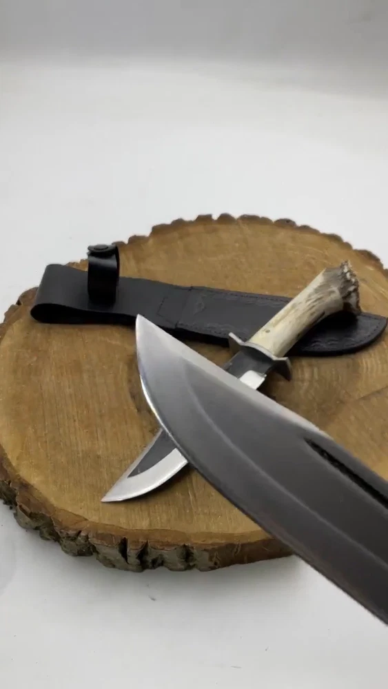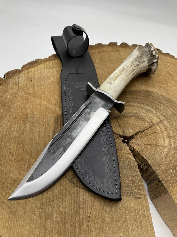 This handmade Antler Crown Bowie knife from Vikings_Armory is the perfect hunting knife for any enthusiast. The blade, made from high-quality carbon steel, measures over 5 inches long and features a drop point edge for precise cuts. The handle is made of genuine horn and is designed for a comfortable grip, whether you are right or left-handed. In addition to its practical uses, this knife is also a beautiful collectible piece. The multi-colored blade and unique antler crown design make it a one-of-a-kind item. A sheath is included for safe and convenient storage. This original, handcrafted knife is the ideal gift for any hunting enthusiast or knife collector. SHIPPING We use DHL or UPS normally. 5-7 Business days delivery and trackable easily. International shipping custom duty is paid by the customer, we are not responsible for the custom duties applied by your countries rules and regulations. For more queries contact us Customization Available Quality is Assure We deliver through DHL Please check Dhl Coverage area before placing order if your Address fall in DHL remote Area List You will have to pay $50 or change your Address Your satisfaction is very important for us if you have any issue contact us first before leaving any bad Review your issue will be resolved more efficiently ASAP Vikings_Armory