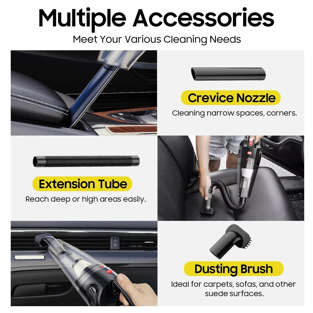 Hand Held Vacuum Cordless Rechargeable - Portable Vacuum Cleaner Mini Car Vacuum with Brushless Motor, Clean Dust & Hair Quickly, Lightweight & Low-Noise for Office/Car/Home Product Details Brand: YFIXQNSU Special Feature: Portable Filter Type: Cartridge Included Components: Accessory Kit Is Cordless?: Yes Brand: YFIXQNSU Special Feature: Portable Filter Type: Cartridge Included Components: Accessory Kit Is Cordless?: Yes Capacity: 0.72 Kilograms Wattage: 120 watts Runtime: 20 minutes Charging Time: 3 Hours Recommended Uses For Product: Carpet, Hard Floor, Sofa, Car Form Factor: Handheld Color: Black Model Name: ZY-2021C Product Dimensions: 12.79"L x 2.24"W x 4.33"H Battery Description: Lithium-Ion Noise Level: 75 dB Amperage: 32.4 Milliamps Battery Life: 3 Hours Manufacturer: YFIXQNSU Number of Items: 1 Controller Type: Push Button Control Method: Touch Style: handheld Connectivity Technology: USB Portable: Yes Number of Handles: 1 Indoor/Outdoor Usage: Indoor UPC: 751767974461 751767970159 751767971903 Item Weight: 1.58 pounds Country of Origin: China Item model number: ZY-2021C Batteries required: No Battery type: Lithium-Ion Cordless & Rechargeable VacuumThis hand held vacuum is lightweight and easy to store. You can effortlessly move between different rooms, cleaning hard-to-reach areas without worrying about the location of power outlets. And the hand vacuum can be easily stored in small spaces. In addition to cleaning your home, car owners can also use this car vacuum cleaner regularly to keep your car's interior clean and improve your driving experience. Efficient Cleaning with Powerful SuctionDespite their small size, wireless portable vacuum cleaners typically have powerful suction and effective cleaning performance, easily handling various dust, debris and dirt. Whats more, it comes with quiet technology to reduce noise levels, making the cleaning process more tranquil. Perfect gifts for Women/Men/Mom/Dad High-Quality FiltrationThis portable vacuum cleaner features efficient filtration systems with a reusable filter. The filter is also washable and can be reused, offering you an environmentally friendly option. Professional AttachmentsThis mini vacuum cleaner is equipped with 3 different attachments. The dusting brush nozzle helps agitate the surface dust, making it easier to be sucked into the vacuum, especially for cleaning dust, debris and hair; The crevice long nozzle used for cleaning narrow spaces, corners, furniture crevices, keyboards, and other hard-to-reach areas. The extension tube makes it easier to reach narrow or high areas, such as shelves or high-up dust. Rechargeable Batteries This small vacuum can be fully charged in 3 hours and run for about 20 minutes. It comes with fast-charging technology, enabling quick recharging and ensuring sufficient power is available when needed, and it can protect the battery and extend the battery life.xcvbgfea