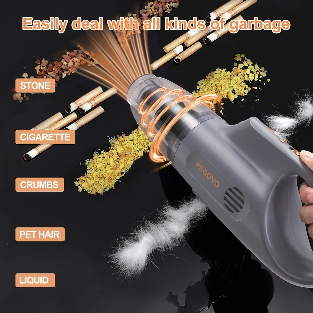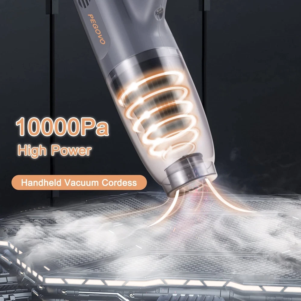 Hand Held Vacuuming Cordless Rechargeable-10KPA High Power Car Vacuum Cordless Cleaner with Fast Charge Tech,Portable Handheld Vacuum Cordless with Long Cleaning Brush&Washable Filter Product Details Style: 10KPA Car Vacuum Brand: PEGOVO MPN: PEG190 Hand Held Vacuum UPC: Does not apply EAN: Does not apply Brand: PEGOVO Special Feature: {LED Light Design}, {Matching Proprietart Chargers}, {30 Minutes Battery Life}, {360-Degree Rotatable Pet Brush}, {Upgraded 10000Pa Suction} See more Filter Type: HEPA Filter Included Components: Washable HEPA Filter, Crevice tool, Pet Brush, Cleaning Brush, User Manual Is Cordless?: Yes Brand: PEGOVO Special Feature: {LED Light Design}, {Matching Proprietart Chargers}, {30 Minutes Battery Life}, {360-Degree Rotatable Pet Brush}, {Upgraded 10000Pa Suction} Filter Type: HEPA Filter Included Components: Washable HEPA Filter, Crevice tool, Pet Brush, Cleaning Brush, User Manual Is Cordless?: Yes Capacity: 1.3 Pounds Runtime: 30 minutes Charging Time: 3.5 Hours Recommended Uses For Product: Tips 1: When you have just received the package, make sure the handheld vacuum cleaner is fully charged before you first use it. Tips 2: When you feel that the suction force of the vacuum cleaner has decreased, please clean the filter screen and dry it before fully charging it to use, which can achieve better suction effect. Form Factor: Handheld Color: Gold With Grey Model Name: PEG190 Hand Held Vacuum Product Dimensions: 13.2"L x 3.2"W x 3.7"H Battery Description: Lithium-Ion Battery Life: 30 minutes Manufacturer: PEGOVO Controller Type: Hand Control Control Method: Touch Style: 10KPA Car Vacuum Portable: Yes Number of Power Levels: 1 Indoor/Outdoor Usage: Outdoor, Indoor Item Weight: 1.2 pounds Item model number: PEG190 Hand Held Vacuum Batteries: 3 Lithium Polymer batteries required. (included) Specific instructions for use: 30 Mins Long Runtime, Upgraded 10000K PA powerful suction,3.5H Fast Charging, Cord-Free Design Lets You Move Freely While Cleaning Stairs, Kitchen, Car, Multi-Functional Attachments and All-Round Clean, Anti-Leakage Film Design, Washable Hepa, Avoid Secondary Pollution of Dust Batteries required: Yes Battery type: Lithium-Ion {Upgraded 10000Pa Suction}: One-click upgrade to the maximum suction power of 10000PA, bringing you the best experience.The super suction meets different cleaning needs. {30 Minutes Battery Life}: There are few ultra-long standby time on the market, which allows you to clean your room, office, car, etc. at one time, and can continue the unfinished cleaning work without secondary charging. {360-Degree Rotatable Pet Brush}: A unique pet brush that can rotate 360 degrees to match your vacuuming work. This brush can be used as a multi-purpose. {Matching Proprietart Chargers}: Not the low-profile USB-C charging configuration, PEGOVO Handheld vacuum cordless rechargeable is equipped with a unique charging head that helps to protect the life of the product, which can be quickly charged in 3.5 hours. {LED Light Design}: The bright LED light on the car vacuum handheld is more suitable for dark or corner cleaning and can better help clean deep corners or crevices.
