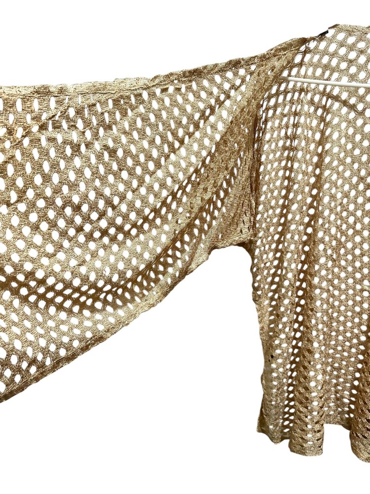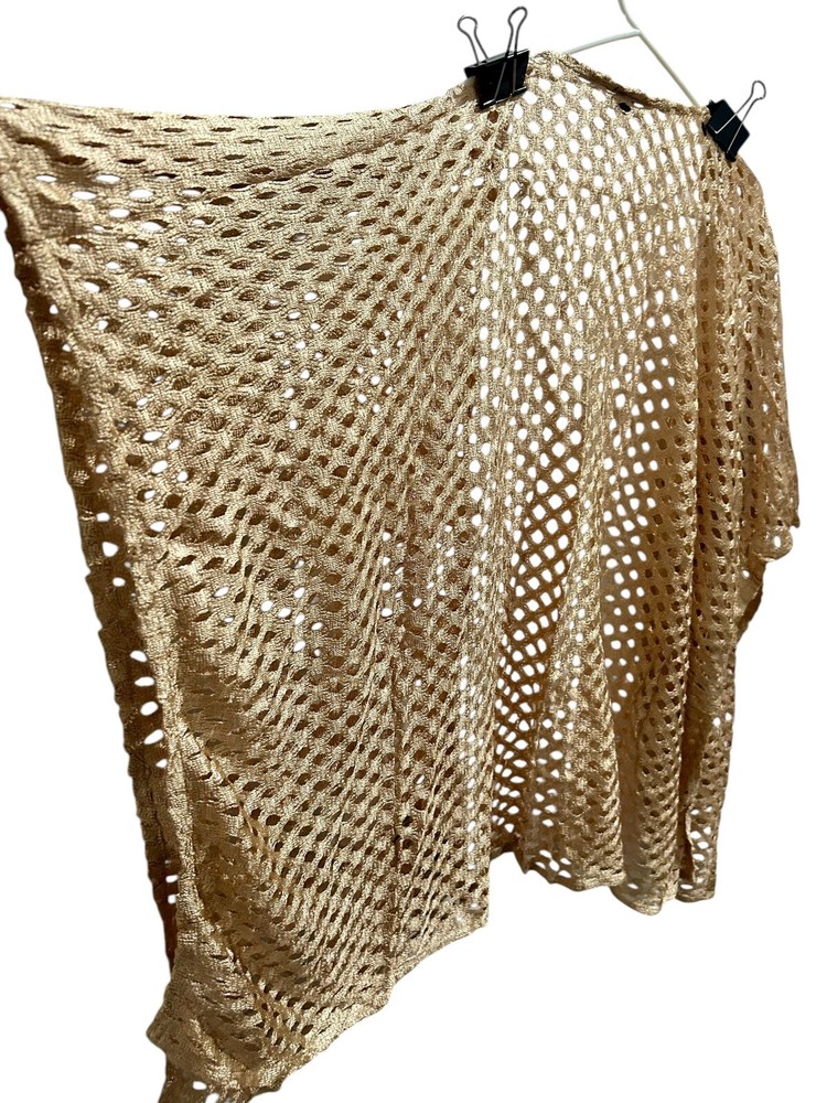 This open front knit crochet wrap shawl in golden tan is an open square scarf that features a boho, hippie, retro, and beach-themed design. It is made of rayon fabric, with accents of crochet detailing. This multifunctional shawl/wrap could also be worn as a beach cover up.