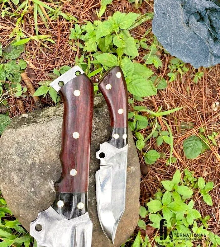 Handmade Survival Bowie Knife Main Blade Specifications: Materials: High graded carbon steel, leather, wood, brass Construction: Hand forged for durability and strength Blade: 13 inches, crafted from 5160 leaf spring from a truck Handle: 6 inches, full tang, made of rosewood, with bone accents Weight: Blade weighs 940 grams; final weight is 1650 grams Scabbard: Made of high-quality leather, ensuring protection and ease of carry Additional Features: Sharpened and ready to use, comes with a 100% warranty Supporting Blade Specifications: Blade: 4 inches, perfect for intricate tasks Handle: 5 inches, full tang Weight: 230 grams This knife set is ideal for survival enthusiasts, providing both a robust main blade and a precise supporting blade for various tasks. The craftsmanship and quality materials ensure reliability and longevity in any situation. Safety Precautions for Your Handmade Survival Bowie Knife Handling: Always handle the knife with care. Hold it firmly, and make sure your hands are dry to avoid slipping. Use the knife only for its intended purposes. Cutting Direction: Always cut away from your body and keep your fingers clear of the blade to prevent accidental injuries. Storage: Store the knife in its leather scabbard when not in use. Keep it out of reach of children and away from places where it can accidentally fall or be accessed by unauthorized individuals. Transport: When transporting the knife, ensure it is securely sheathed and fastened to prevent it from slipping out or getting damaged. Do not carry the knife loosely in your pocket or bag. Environment: Be mindful of your surroundings when using the knife. Avoid using it in crowded or unstable environments where accidental slips could cause harm. Maintenance: Regularly inspect the knife for any signs of damage, such as cracks or chips in the blade or handle. Do not use the knife if it shows signs of damage, and get it repaired by a professional. Sharpening: Exercise caution when sharpening the blade. Use a proper sharpening tool and follow safety guidelines to avoid accidents. Training: If you are not experienced in using knives, seek proper training or practice safe handling techniques before using the knife in critical situations. Emergency: Keep a first aid kit nearby when using the knife, especially during outdoor activities. In case of an injury, seek immediate medical attention. By following these safety precautions, you can enjoy using your handmade survival bowie knife safely and effectively. Stay safe and happy adventuring!