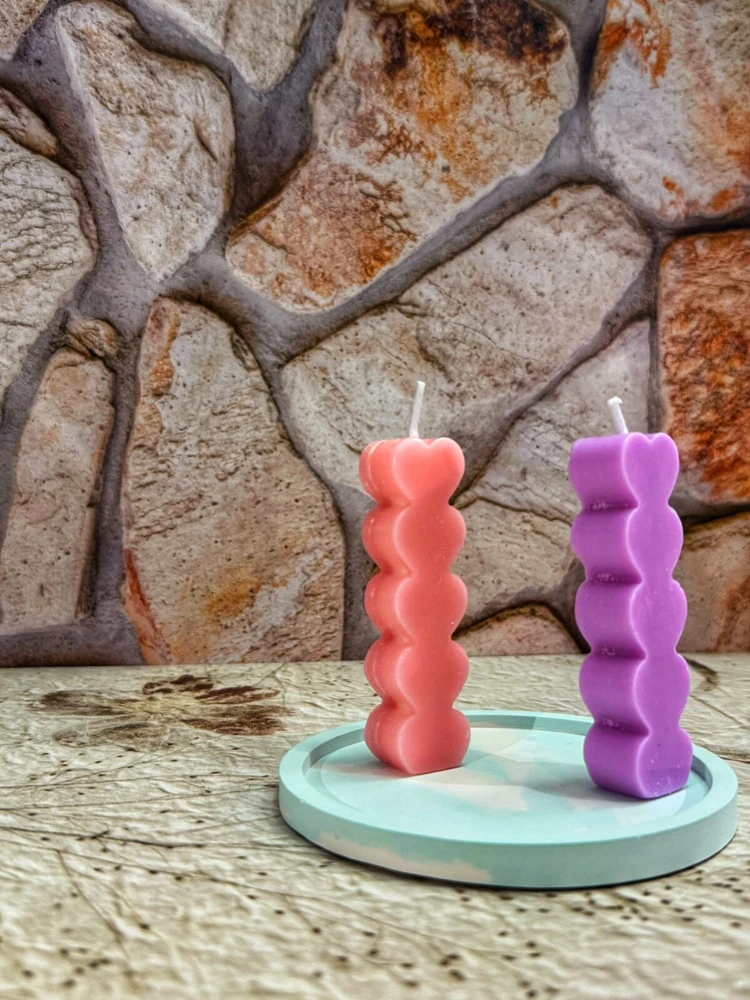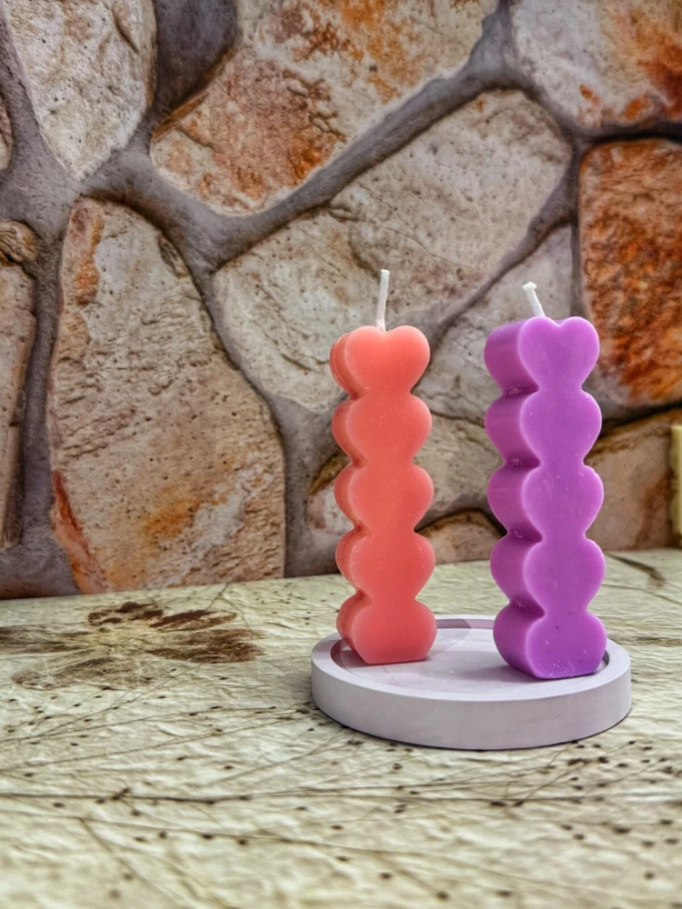 The candle is heart-shaped, small, multicolored, and made of soy wax. It is scented with vanilla and has a modern style. It is 4 inches in length, 4 inches in height, and 1 inch in width. It weighs 5 ounces and has a burning time of 1-2 hours. This handmade decorative candle comes in a set of 2 and is suitable for various rooms like the entryway, bedroom, living room, and dining room.