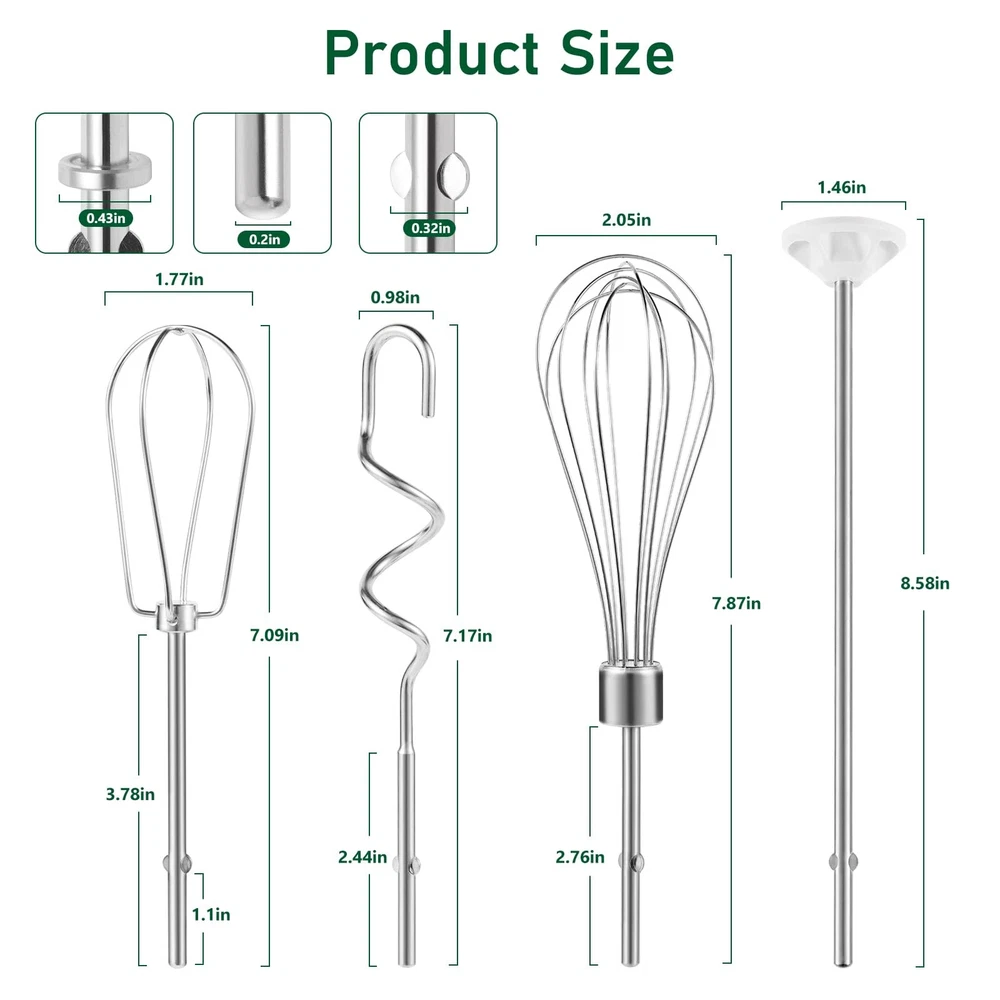Hand Mixer Attachments for Kitchenaid: Including stainless steel hand mixer Accessories 1 whisk, 1 blending rod, left and right turbo style stainless steel beaters, 1 dough hook compatible with kitchenaid hand mixers Function of Beater and Whisk: The hand mixer accessory whisk mixes air into the mixture for a light and fluffy texture, can be used for whipping cream, making meringue, mixing cake batters, creams, egg whites, etc., and provides optimal mixing performance Function of Blending Rod and Dough Hooks: Stainless Steel Dough hooks are used to promote the development of gluten in the dough and to strengthen the dough structure, especially important for baking breads, pizza crusts, etc. And blending rod is used to make milkshakes or smoothies Compatible with Kitchenaid Hand Mixer: Hand Mixer Attachment Replacement Parts Stirring Stick, Whisk, Beater and Dough Hook, Compatible with Kitchen Aid Hand Mixer KHM3 KHM5 KHM7 KHM9 Stainless Steel Attachment: Food grade 304 stainless steel hand mixer attachment for easy hand or machine cleaning, easy to install, pop up and use Hand Mixer Attachments for Kitchenaid: Including stainless steel hand mixer Accessories 1 whisk, 1 blending rod, left and right turbo style stainless steel beaters, 1 dough hook compatible with kitchenaid hand mixers Function of Beater and Whisk: The hand mixer accessory whisk mixes air into the mixture for a light and fluffy texture, can be used for whipping cream, making meringue, mixing cake batters, creams, egg whites, etc., and provides optimal mixing performance Function of Blending Rod and Dough Hooks: Stainless Steel Dough hooks are used to promote the development of gluten in the dough and to strengthen the dough structure, especially important for baking breads, pizza crusts, etc. And blending rod is used to make milkshakes or smoothies Compatible with Kitchenaid Hand Mixer: Hand Mixer Attachment Replacement Parts Stirring Stick, Whisk, Beater and Dough Hook, Compatible with Kitchen Aid Hand Mixer KHM3 KHM5 KHM7 KHM9 Stainless Steel Attachment: Food grade 304 stainless steel hand mixer attachment for easy hand or machine cleaning, easy to install, pop up and use