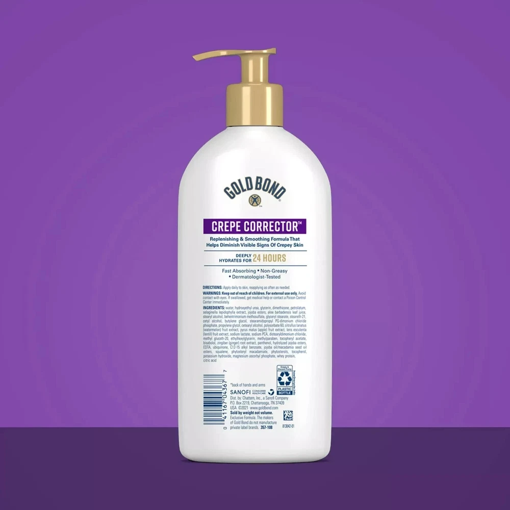 Gold Bond Age Renew Crepe Corrector Hand Moisturizer, Body Lotion, and Face Cream for Tighter Skin, 14 oz Contains: One (1) 14-oz. bottle of Gold Bond Age Renew Crepe Corrector Body Lotion, Replenishing & Smoothing Formula. Gold Bond Crepe Corrector Lotion helps diminish visible signs of crepey skin, such as fine, thin wrinkles. Gold Bond Lotion for dry, crepey skin moisturizes skin for 24 hours for lasting hydration. This lightweight lotion is fragrance free, fast absorbing, non-greasy and tested by dermatologists. This unique smoothing concentrate features protective antioxidants, powerful botanicals and nourishing omega-fatty acids. Level up your #trifecta skincare routine with Gold Bond Age Renew Crepe Corrector Hand, Face and Body Lotion.