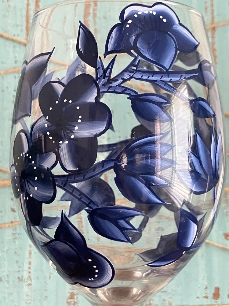 Add a touch of elegance to your next wine party with this set of 2 hand painted wine glasses. The beautiful blue flowers and vines design on each stem is meticulously crafted by hand, making these glasses a unique addition to your collection. The glasses are made of high quality materials and are perfect for any occasion. Whether you're a wine connoisseur or just looking for a special gift, these glasses are sure to impress.
