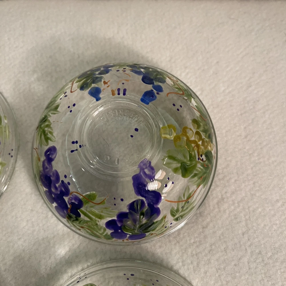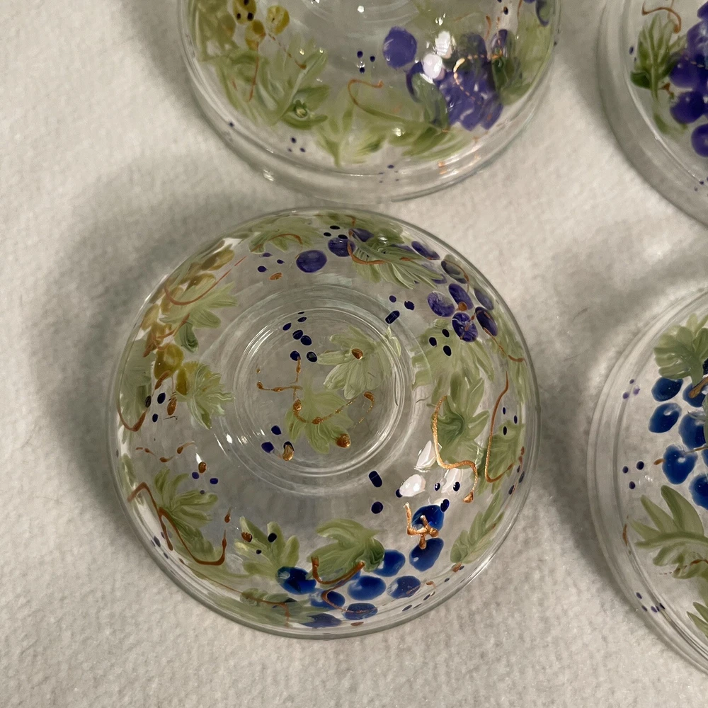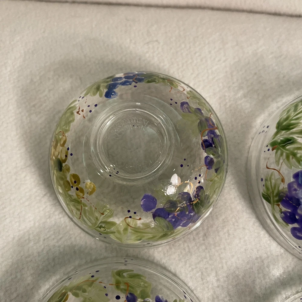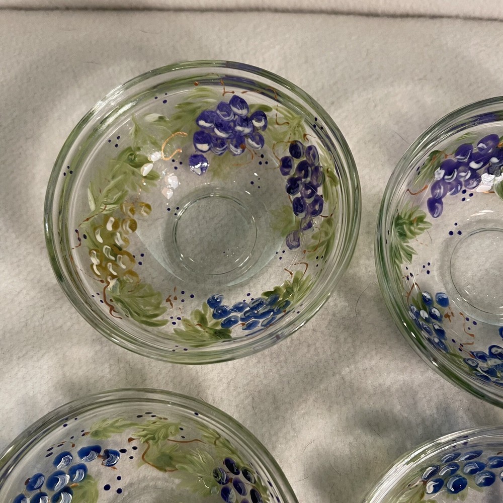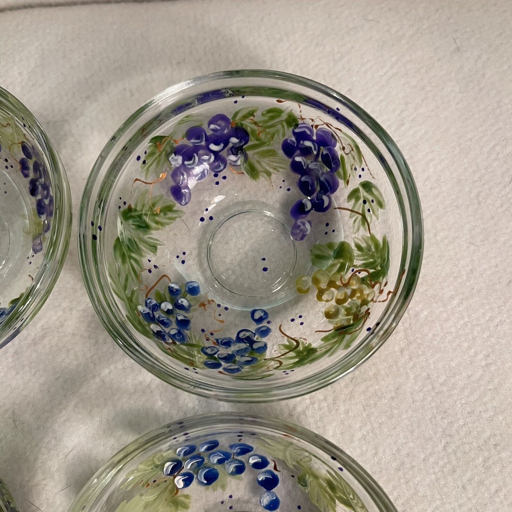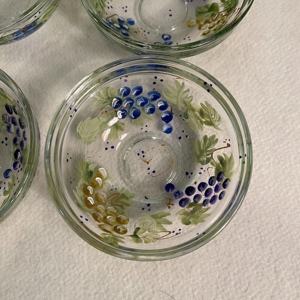 This is a vintage set of four hand-painted decorative bowls made of clear glass. Each bowl has a grapevine pattern fused into the glass, giving it an art nouveau style. Measuring 3.5 inches in diameter and 1.5 inches in height, these bowls are suitable for all occasions and can be used for serving dips, sauces, or as prep bowls. The set weighs 25.8 ounces and is from the 1980s, featuring a multicolor design that adds a touch of elegance to any table setting. Excellent condition. No chips or cracks.
