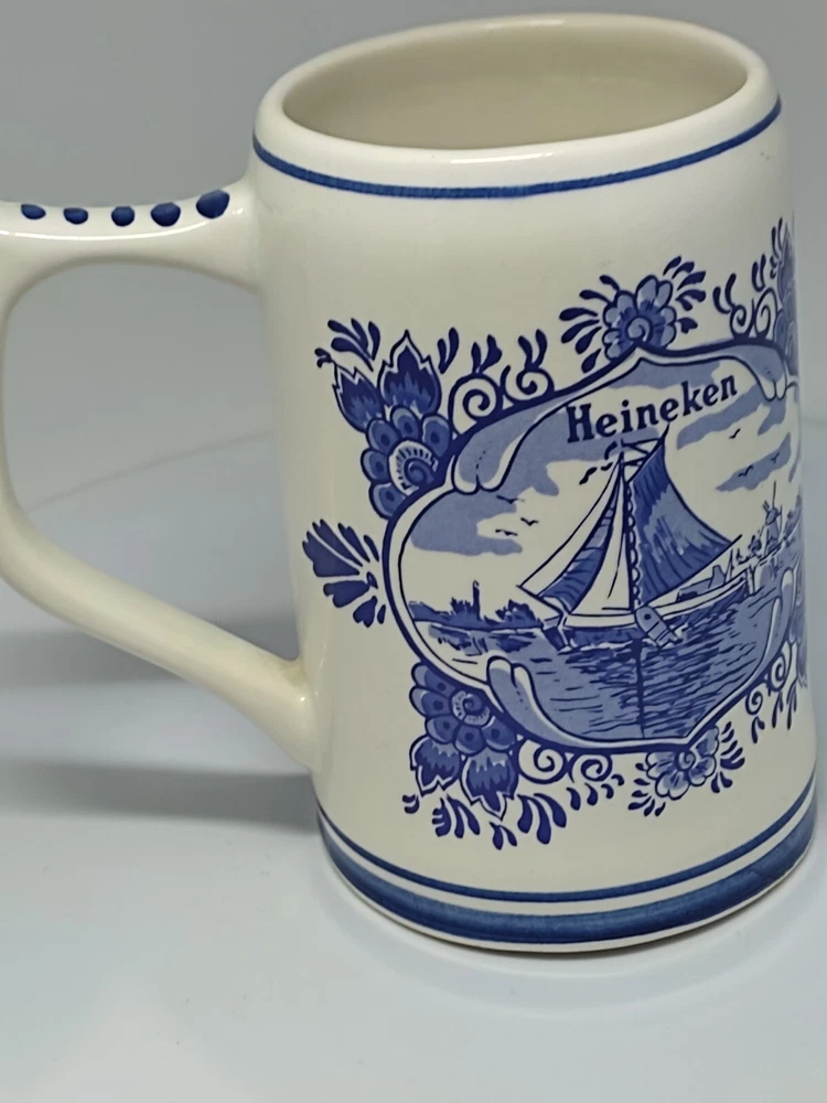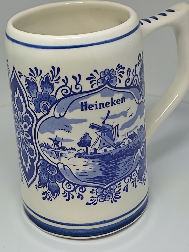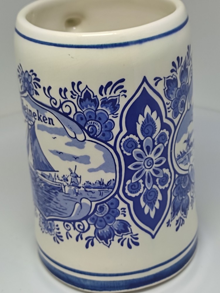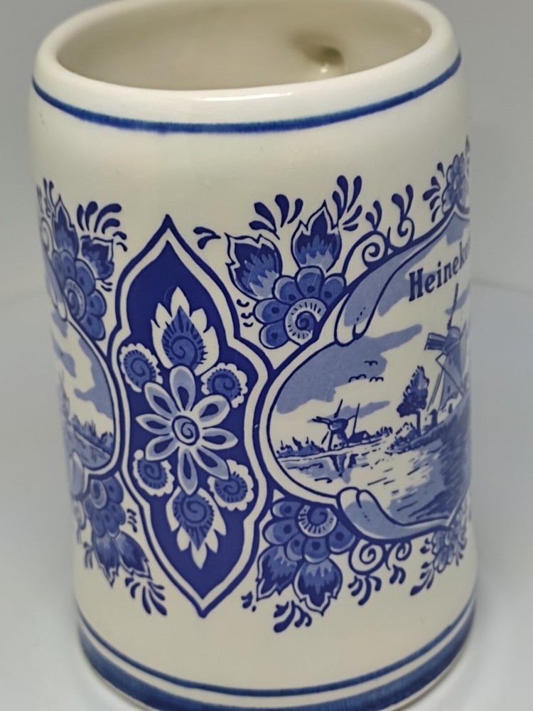 This beautiful ceramic beer mug from Heineken is a must-have for any fan of Dutch culture and retro style. With a height of approximately 13 cm and a diameter of approximately 7.5 cm, this round mug features a hand-painted Delft blue design showcasing the landscapes of the Netherlands. The mug is adorned with a painted backstamp and has a sturdy handle for easy use, making it perfect for all occasions. The production style of this mug is Delft, and it is an original piece from Holland, with no signs of use or damage. It is a collectable item that will add a touch of vintage charm to your drinkware collection. The mug is perfect for adults who enjoy a decorative and functional piece of pottery. So, whether you're a fan of Heineken or just appreciate the beauty of Dutch art, this mug is sure to impress. P04