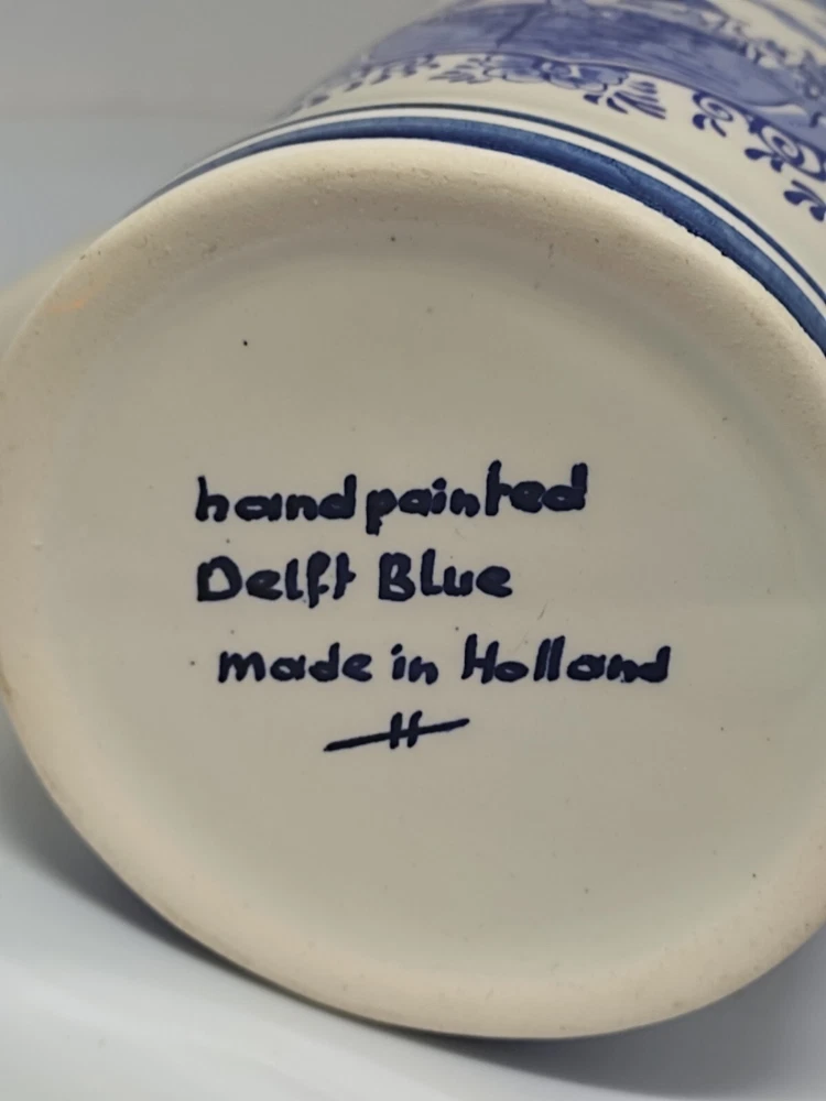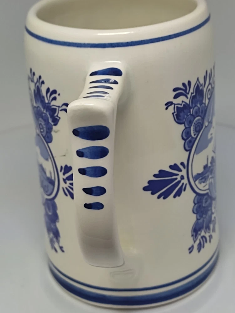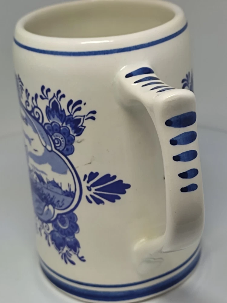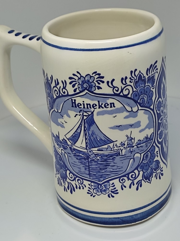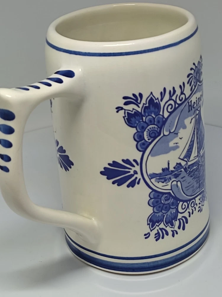 This beautiful ceramic beer mug from Heineken is a must-have for any fan of Dutch culture and retro style. With a height of approximately 13 cm and a diameter of approximately 7.5 cm, this round mug features a hand-painted Delft blue design showcasing the landscapes of the Netherlands. The mug is adorned with a painted backstamp and has a sturdy handle for easy use, making it perfect for all occasions. The production style of this mug is Delft, and it is an original piece from Holland, with no signs of use or damage. It is a collectable item that will add a touch of vintage charm to your drinkware collection. The mug is perfect for adults who enjoy a decorative and functional piece of pottery. So, whether you're a fan of Heineken or just appreciate the beauty of Dutch art, this mug is sure to impress. P04